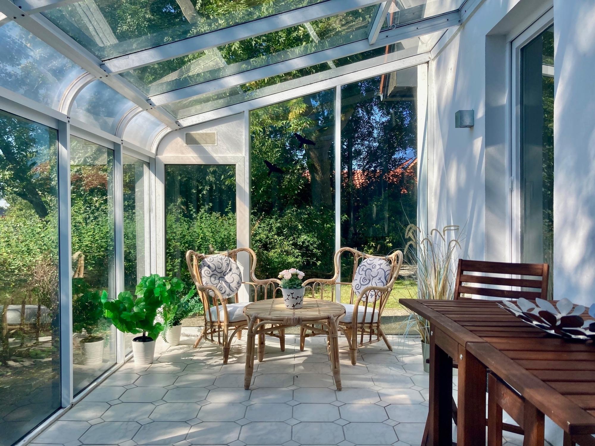 Separater Eingang, Flur. Wohn-/Schlafraum mit Sitzgruppe/Doppelbettcouch (1,40m x 2m), Smart/Sat-TV, Mini-Stereoanlage, Internetzugang (wlan, gratis), Zugang zu Wintergarten (unbeheizt) mit Essplatz sowie kleiner Sitzecke, von hier Ausgang ins Freie. Separate Küche (4 Kochfelder, Backofen, Geschirrspüler, Kühlschrank, Ka?eemaschine, Toaster, Wasserkocher) mit Essplatz, Zugang zu Wintergarten. Doppelzimmer. Dusche/WC, Waschmaschine.