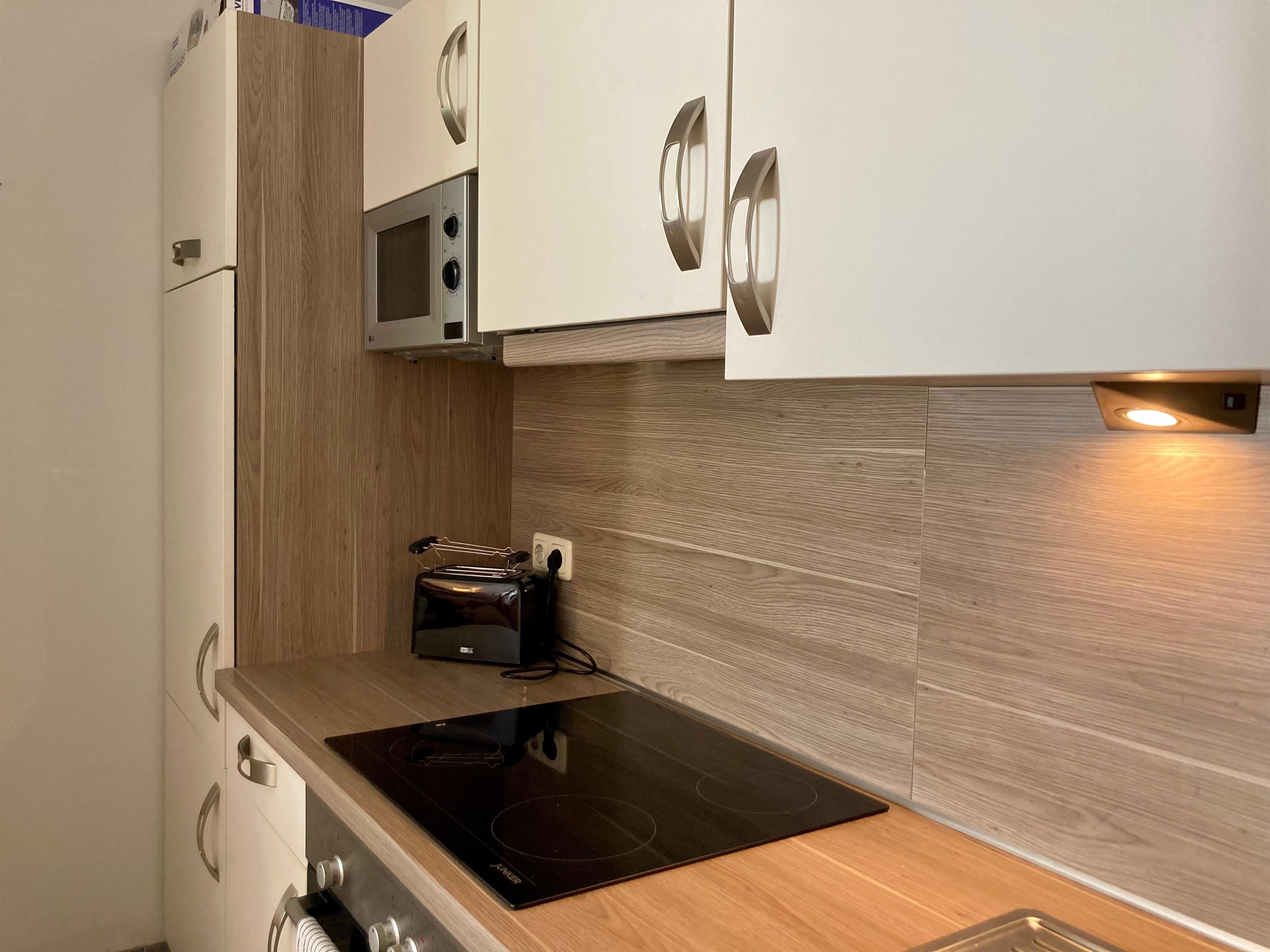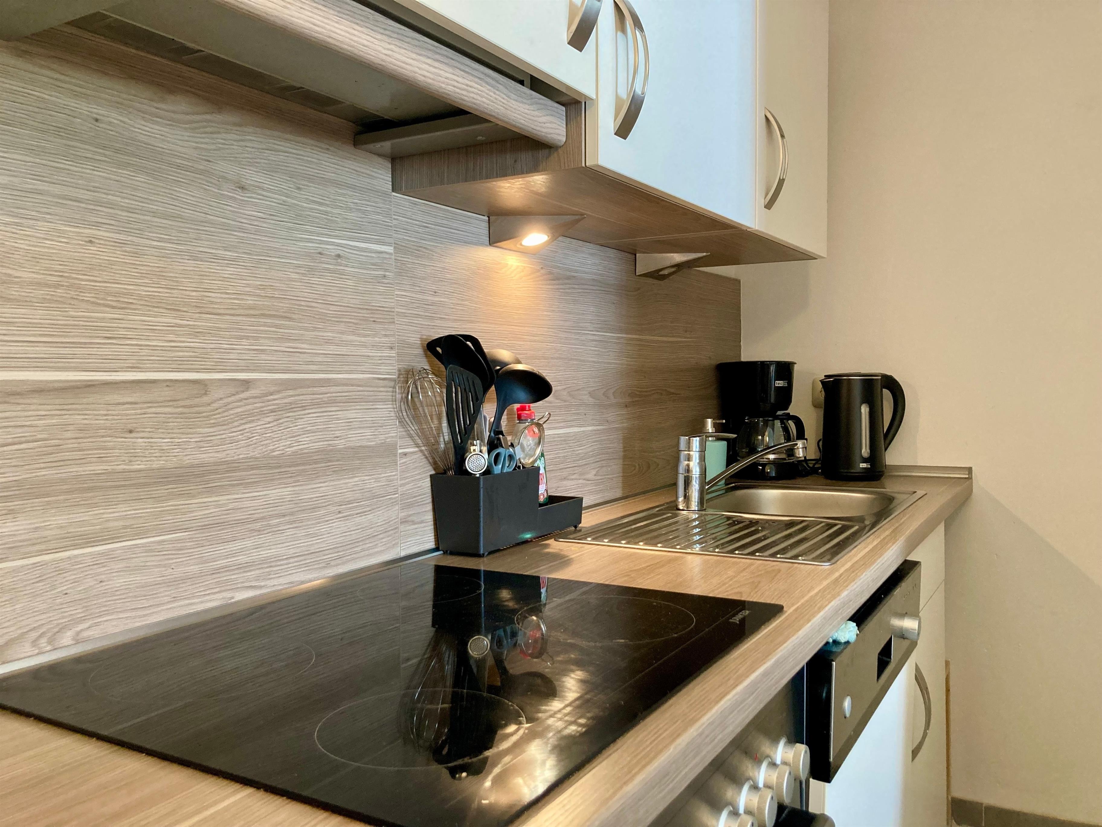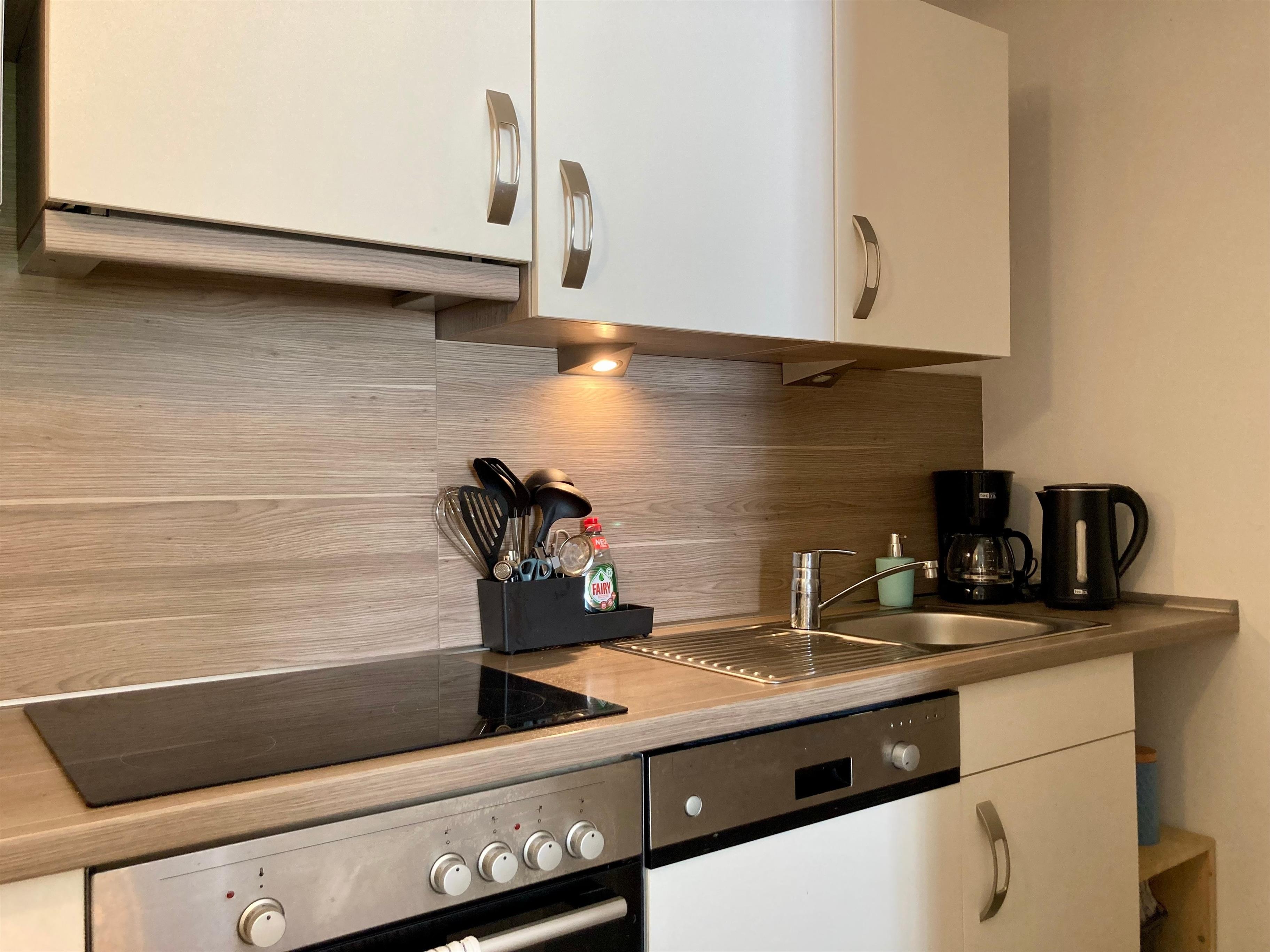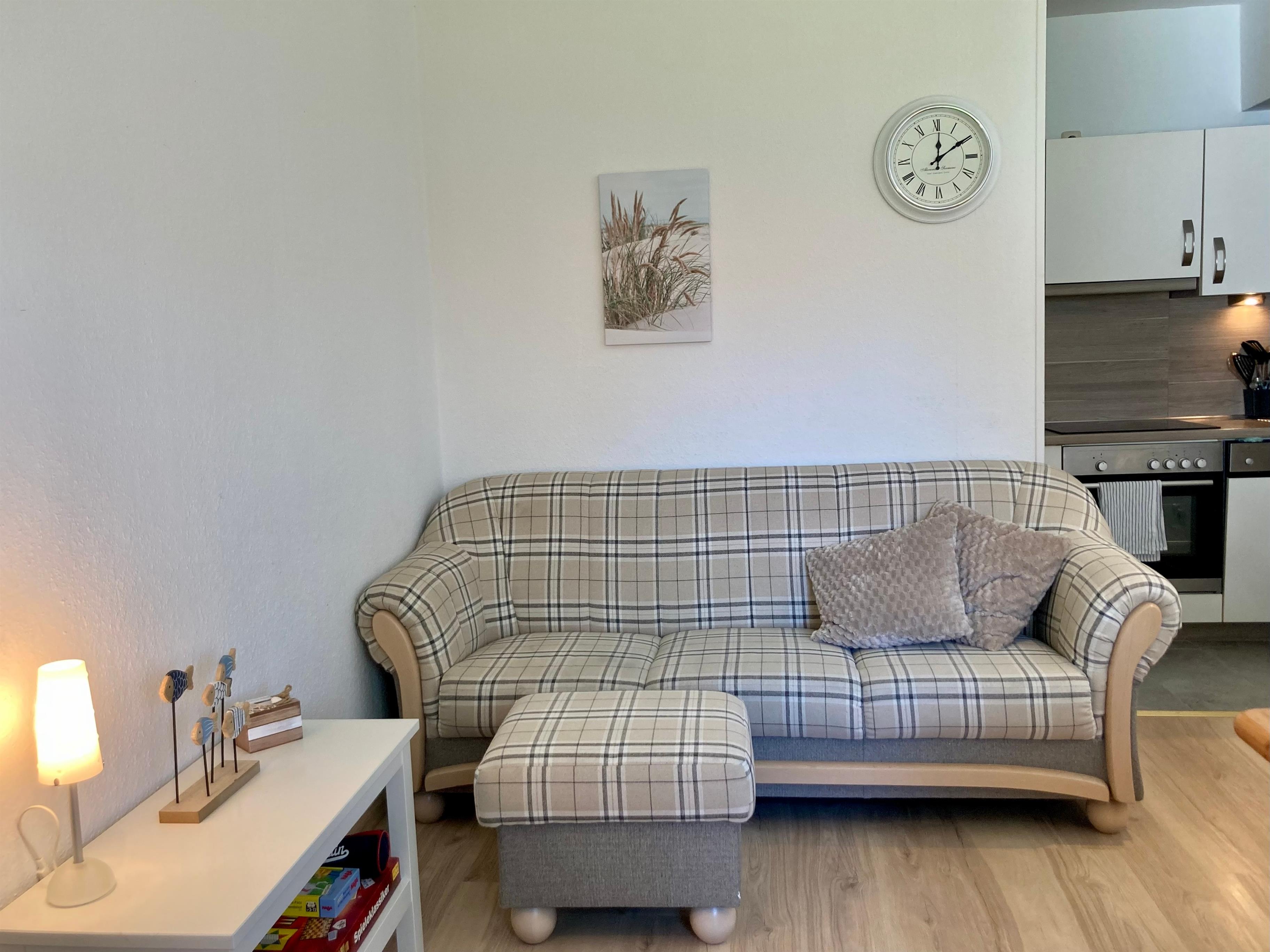 Separater Eingang, kleiner Flur. Wohnraum mit Sitzgruppe, Sat-TV, Internetzugang (wlan, gratis) und Essecke für 4 Personen. Zum Wohnraum offene Küche (4 Kochfelder, Backofen, Mikrowelle, Geschirrspüler, Kaffee-/Kaffeepadmaschine, Kühlschrank (Gefrierfach), Toaster, Wasserkocher). Doppelzimmer. Schlafzimmer mit Etagenbett. Dusche/WC, mit Fön und Waschmaschine (Toplader).
