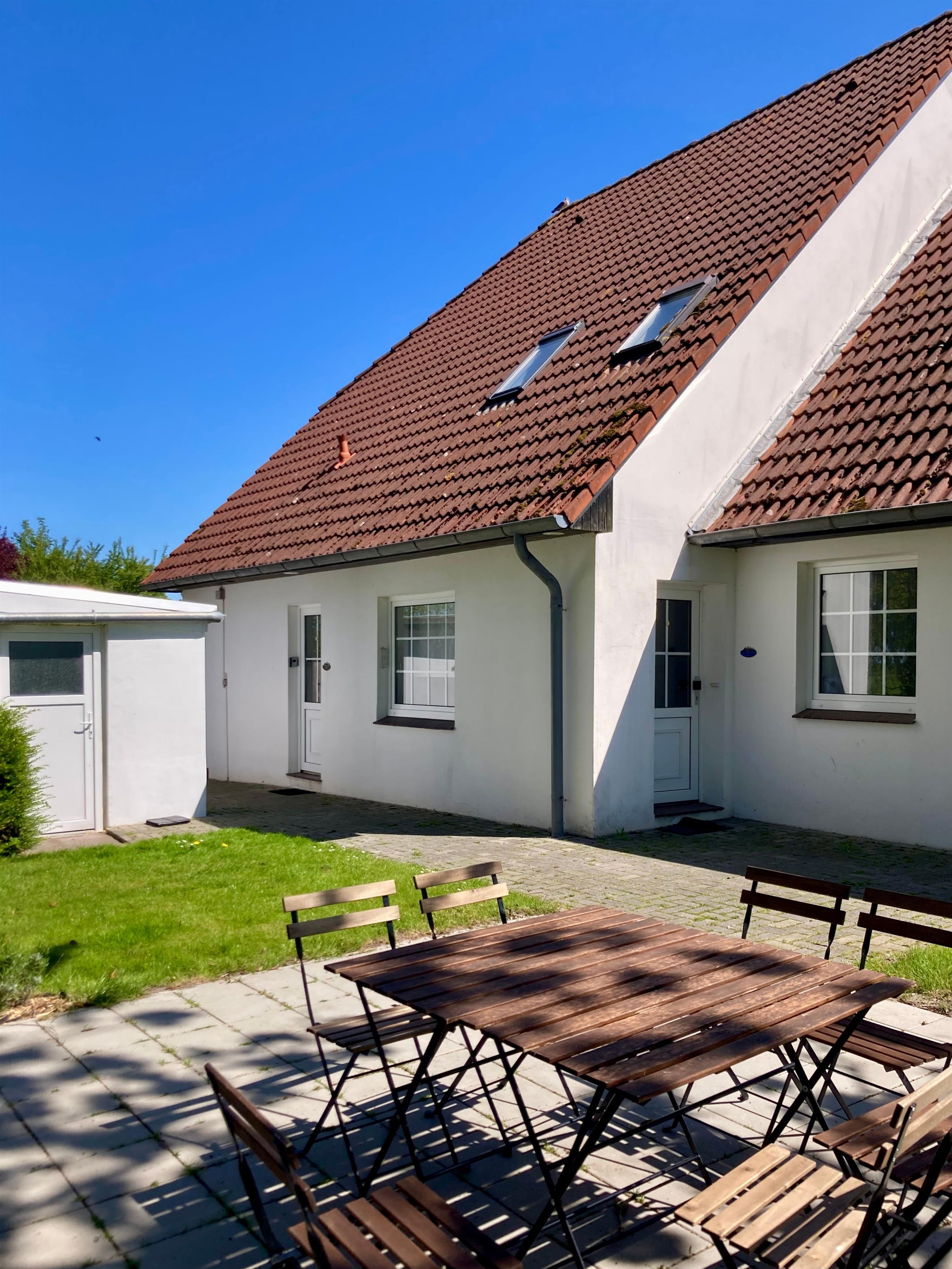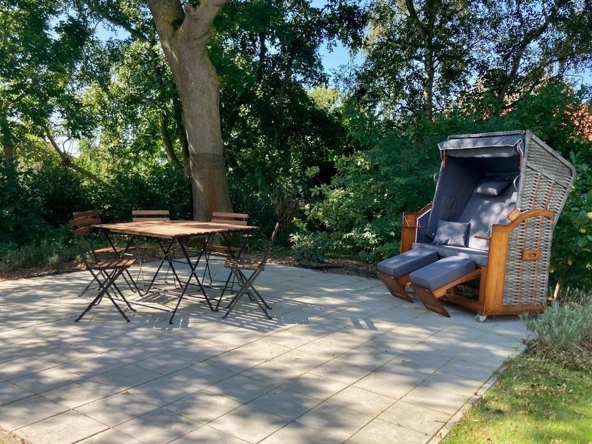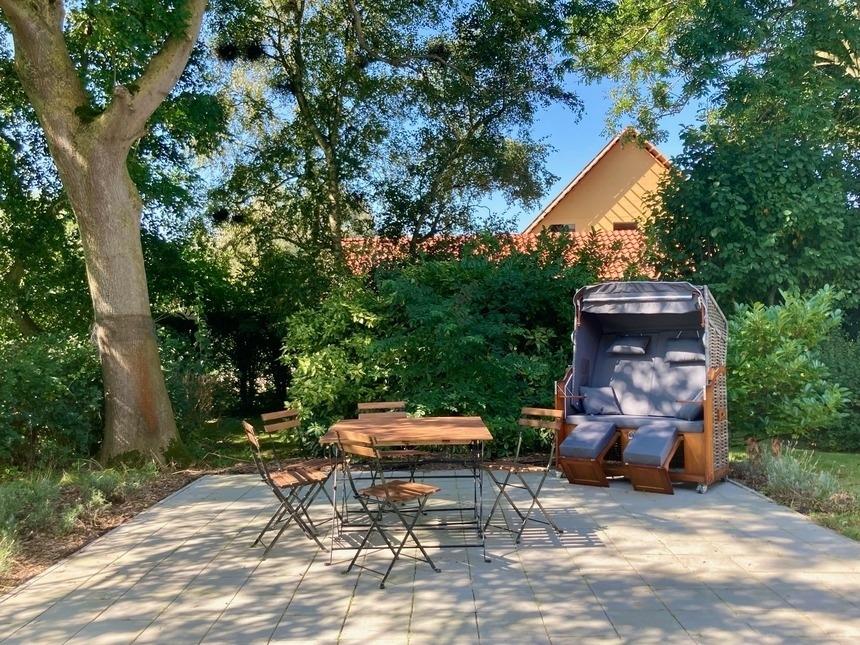 Am Haus Freisitz, Zugang zu kleinem Garten-/Rasenanteil mit altem Baumbestand sowie großer Terrasse mit Strandkorb, Tisch und 6 Stühlen zur gemeinsamen Nutzung. Eigener kleiner Tisch, 2 Stühle und 1 Liegestuhl (frei aufstellbar). Über Hecken und Büsche unverbauter Blick auf unmittelbar angrenzende Felder.