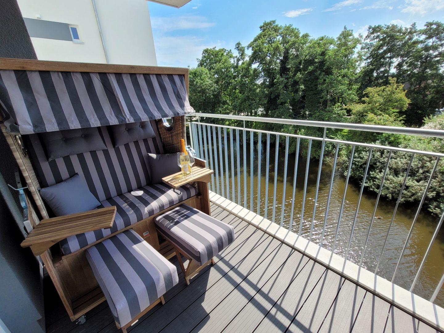 Ein großzügiger, möblierter und überdachter, nach Süden zum Wasserlauf ausgerichteter Balkon lädt zum Verweilen ein.