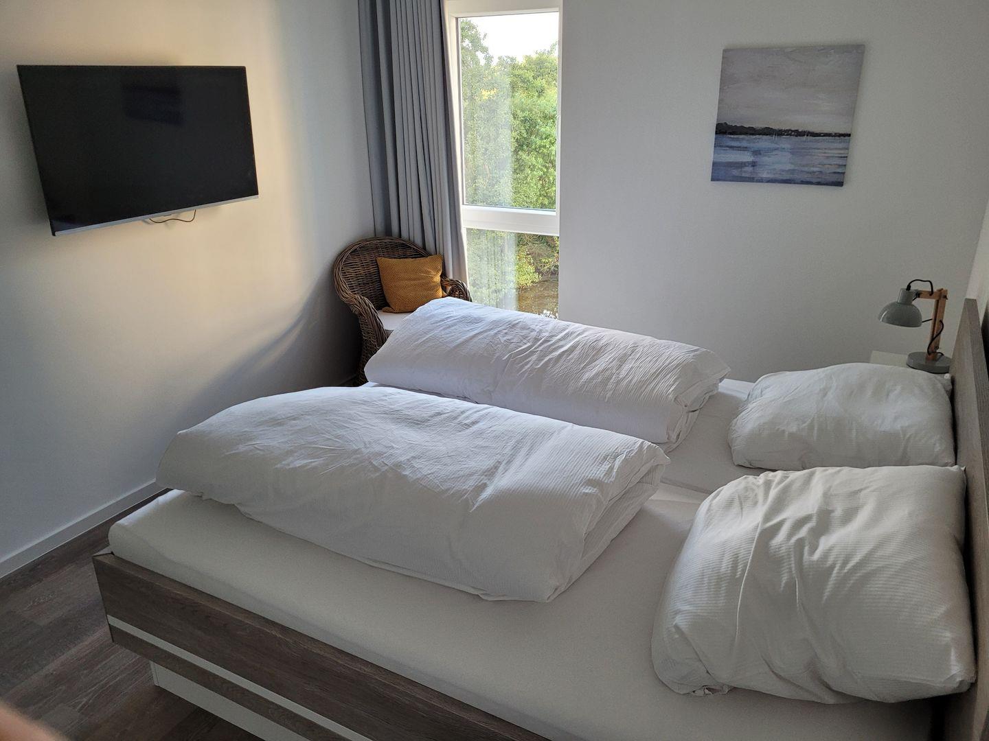 In jedem Schlafzimmer steht Ihnen ein Doppelbett mit Nachtkonsolen, ein Kleiderschrank und ein zusätzlicher Fernseher zur Verfügung.