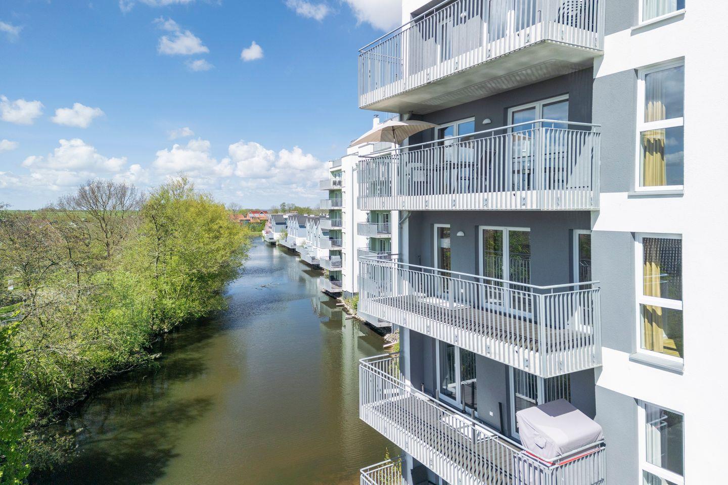 Ein großzügiger, möblierter und überdachter, nach Süden zum Wasserlauf ausgerichteter Balkon lädt zum Verweilen ein.