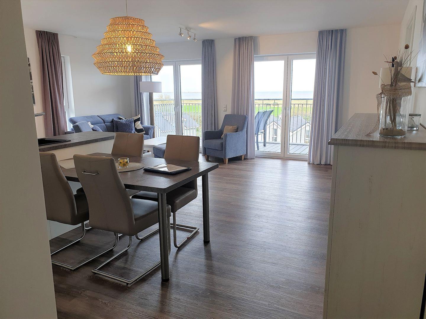 Ein großzügiger, möblierter und überdachter, nach Norden ausgerichteter Balkon bietet Ihnen einen wunderbaren Blick auf das Wattenmeer und lädt zum Verweilen ein.