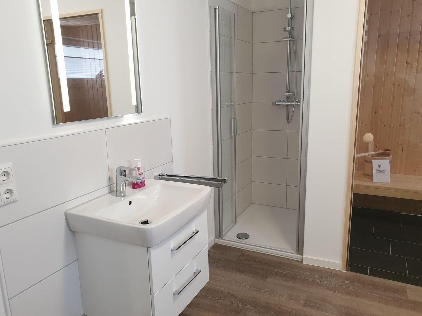 An stürmischen und/oder regnerischen Tagen kann das Badezimmer mit eigener Sauna und seiner Vollausstattung schnell zum Wellnesstempel werden. Hier bieten eine Sauna, eine Regendusche und eine Badewanne den nötigen Komfort zur Erholung. Saunadüfte für Ihre persönlichen Saunamomente können Sie an unserer Rezeption erwerben.