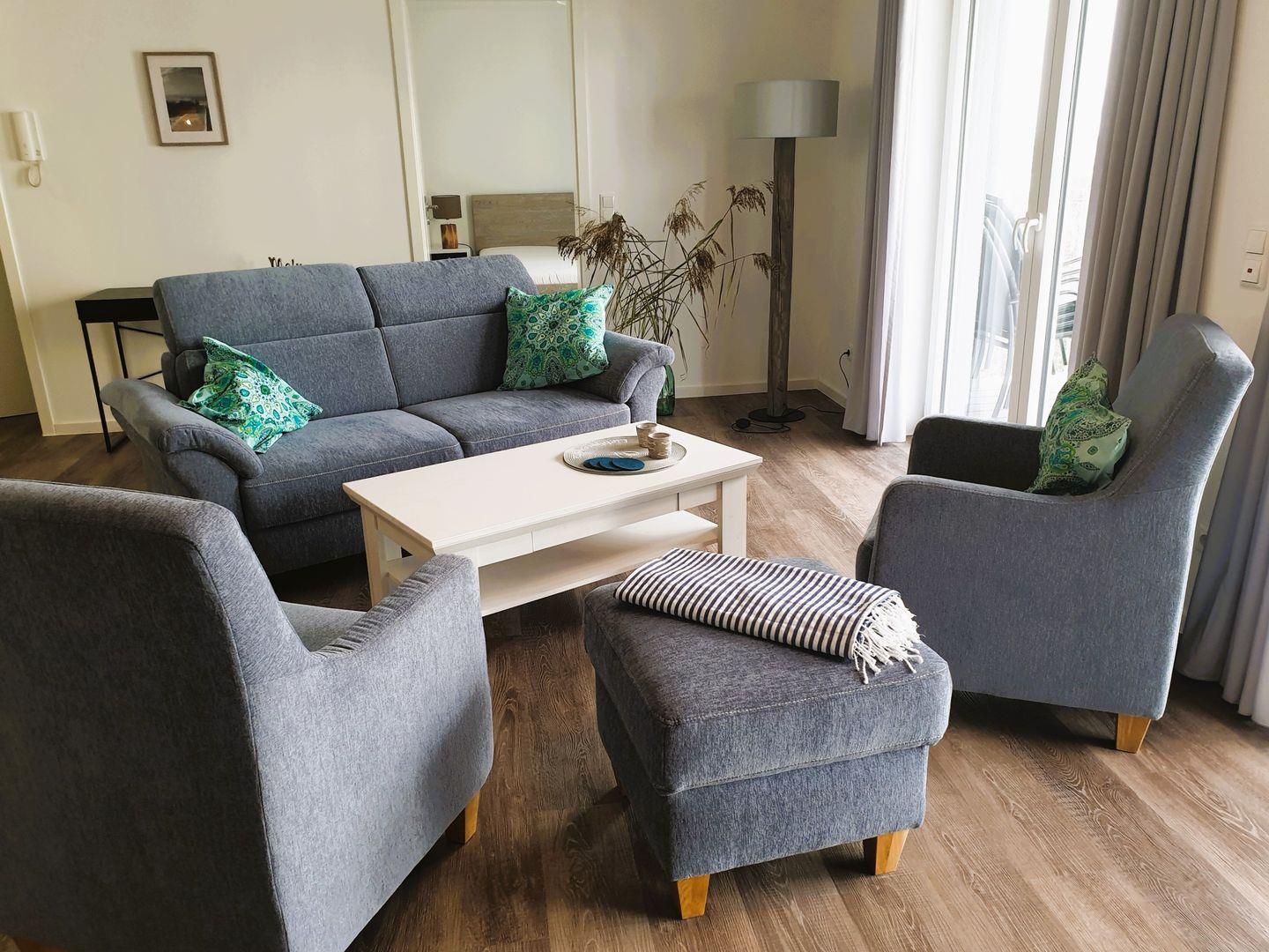 Der helle und freundliche Wohnbereich verfügt über ein Sofa, einen Couchtisch, zwei Sessel und einem Fernseher.