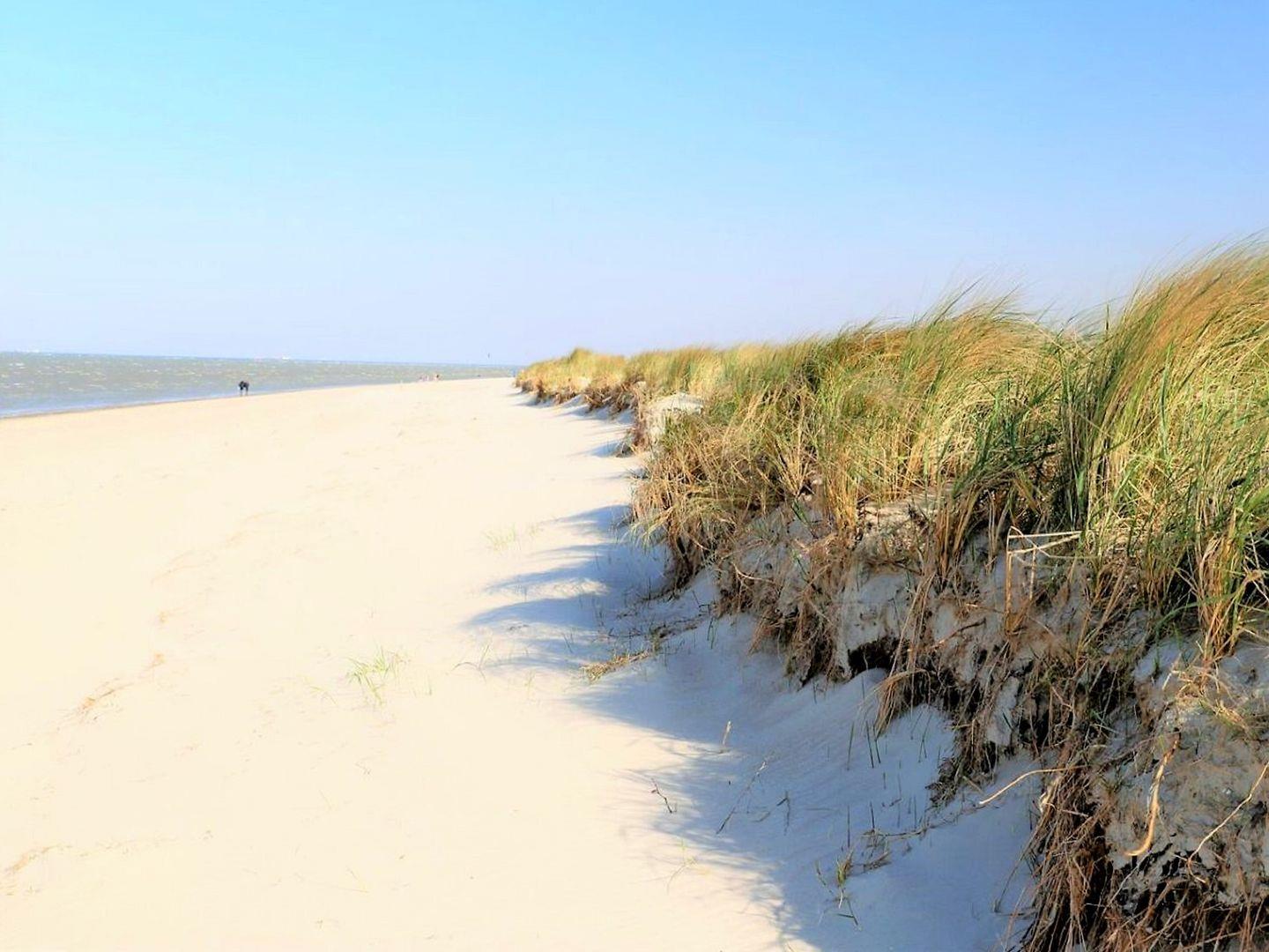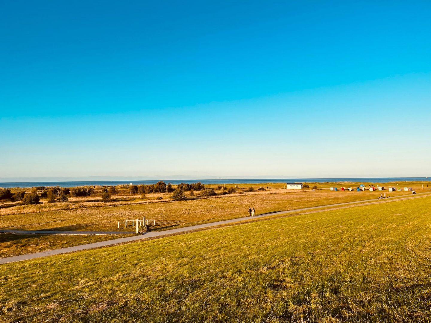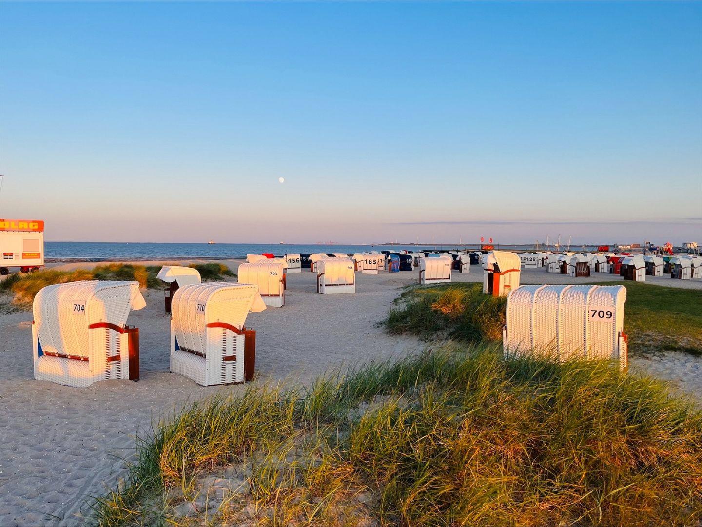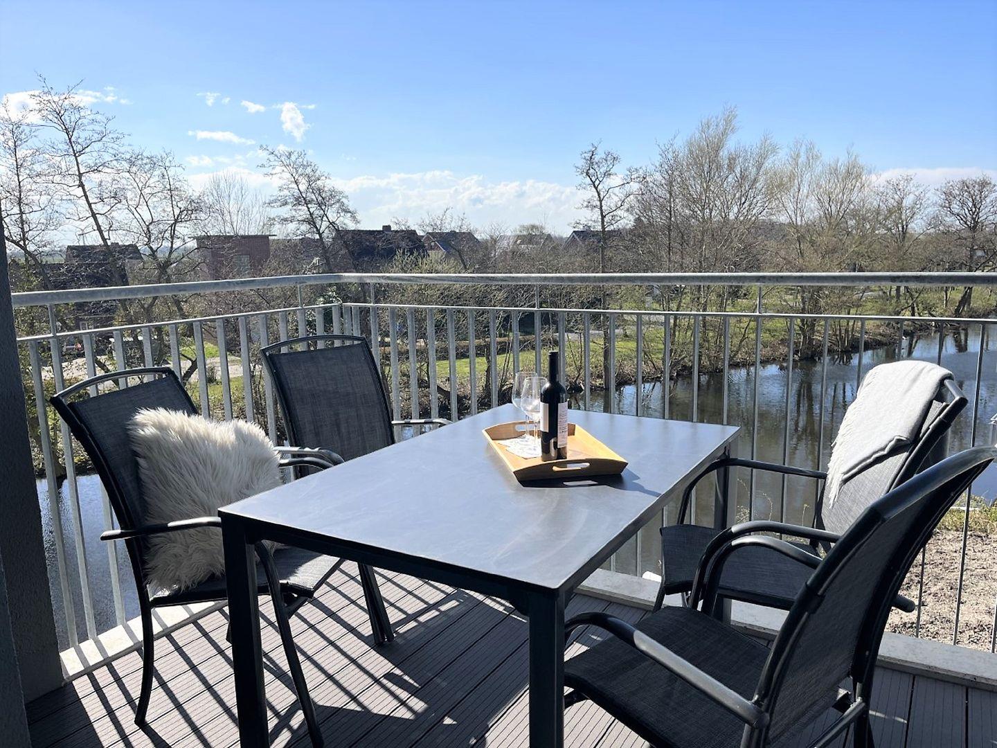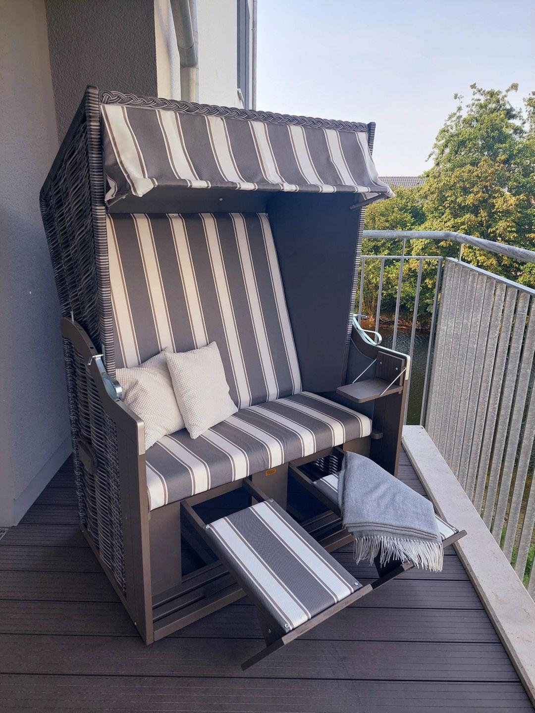Ein großzügiger, möblierter und nach Westen ausgerichteter Balkon lädt zum Verweilen ein. Ein Strandkorb rundet das friesische Bild ab.