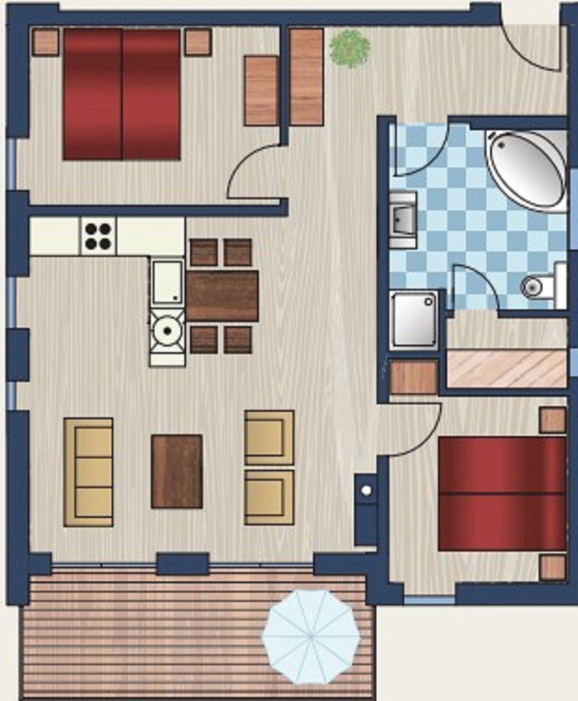 Zwei Schlafräume und der großzügige Wohnbereich mit offener Küche heißen Sie herzlich willkommen.