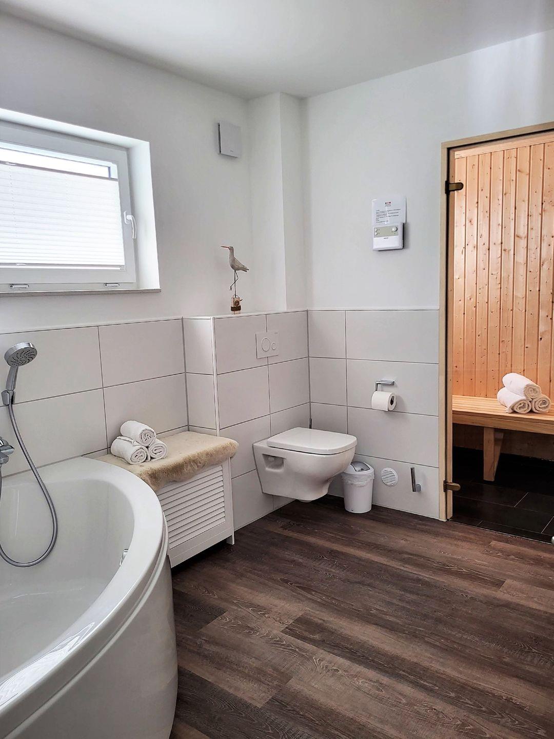 An stürmischen und/oder regnerischen Tagen kann das Badezimmer mit eigener Sauna und seiner Vollausstattung schnell zum Wellnesstempel werden.