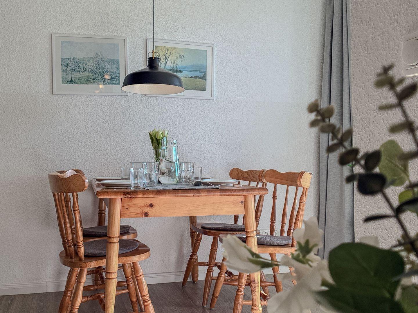 Eine Essgruppe für 4 Personen und der angrenzende Balkon sorgen für angenehme Momente.