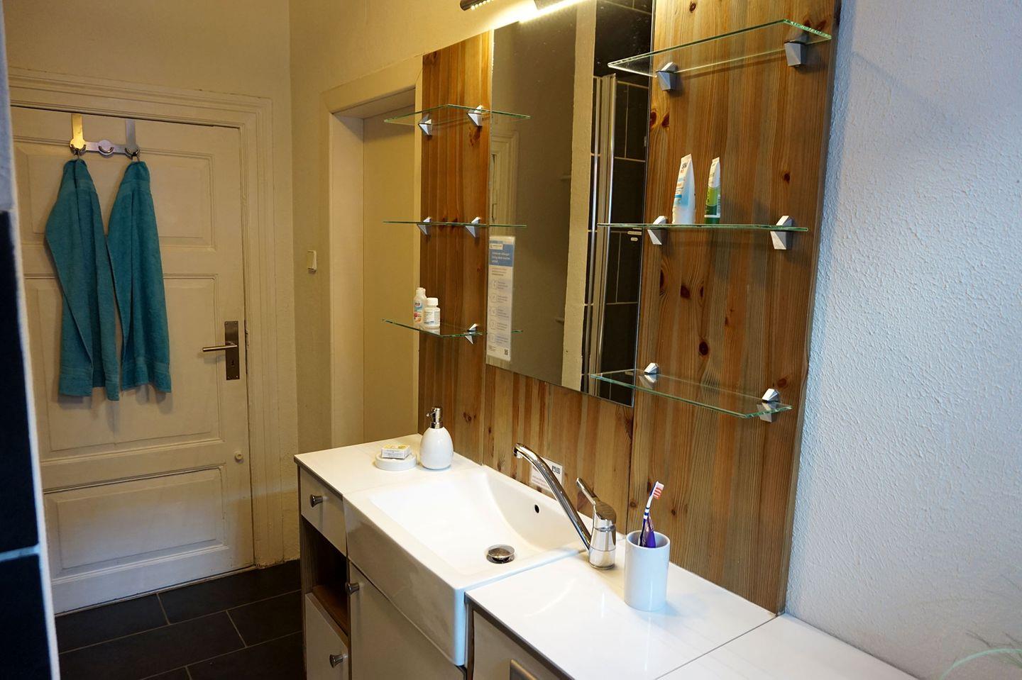 Das Badezimmer verfügt über eine geräumige Dusche und einen großen Wand- sowie Kosmetikspiegel und ist vom Schlafzimmer sowie vom Flur zugänglich.