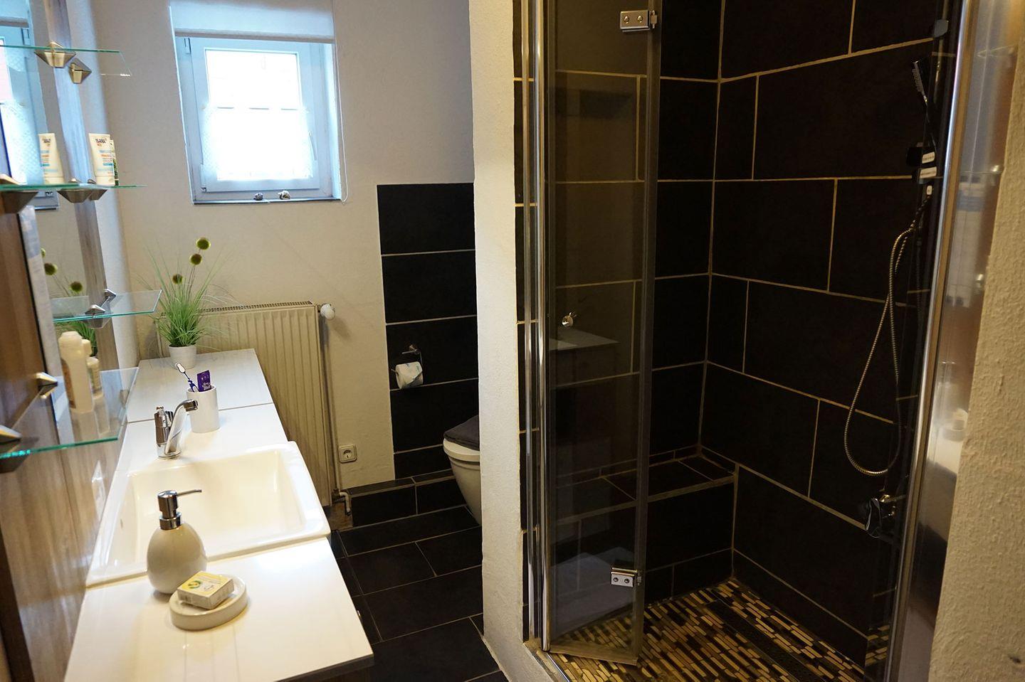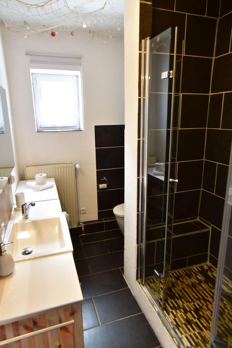 - geräumige Dusche, Wandspiegel, Kosmetikspiegel, WC-Papier, Badvorleger