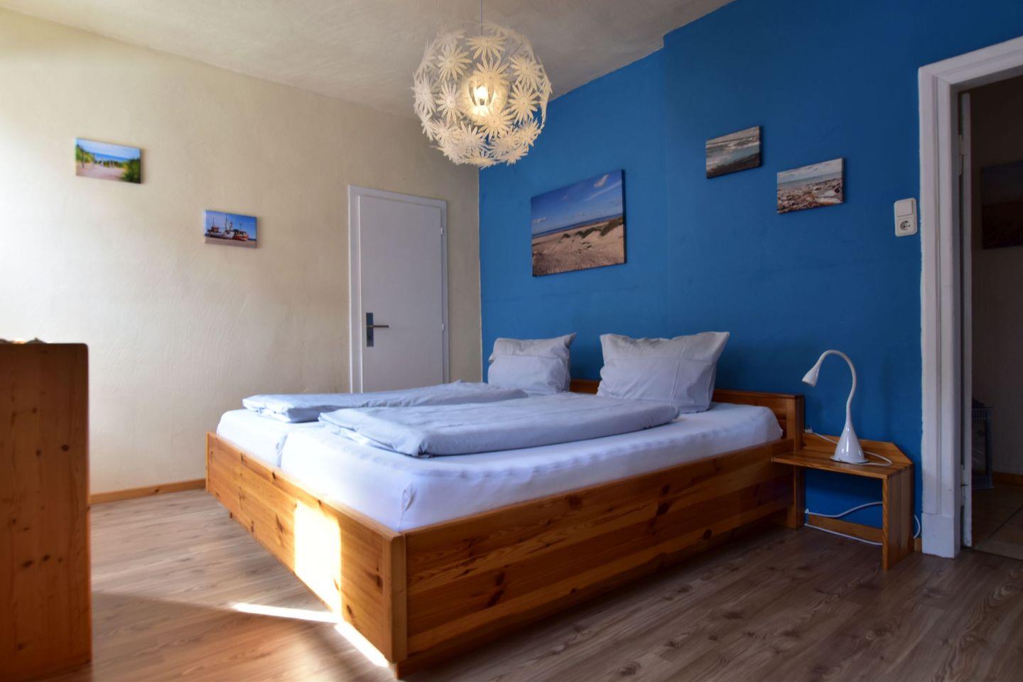 - großes Doppelbett, Kleiderschrank, Kommode, Nachttische, Nachttischlampen, Spiegel