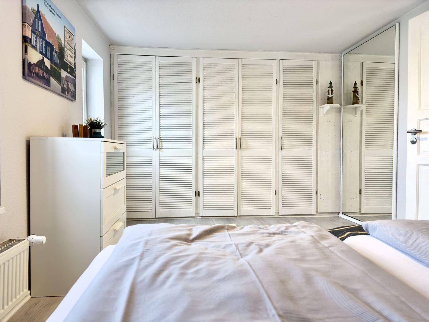 - Doppelbett, Einbauschrank, Wandspiegel, Kommode, Nachttisch, Nachttischlampe