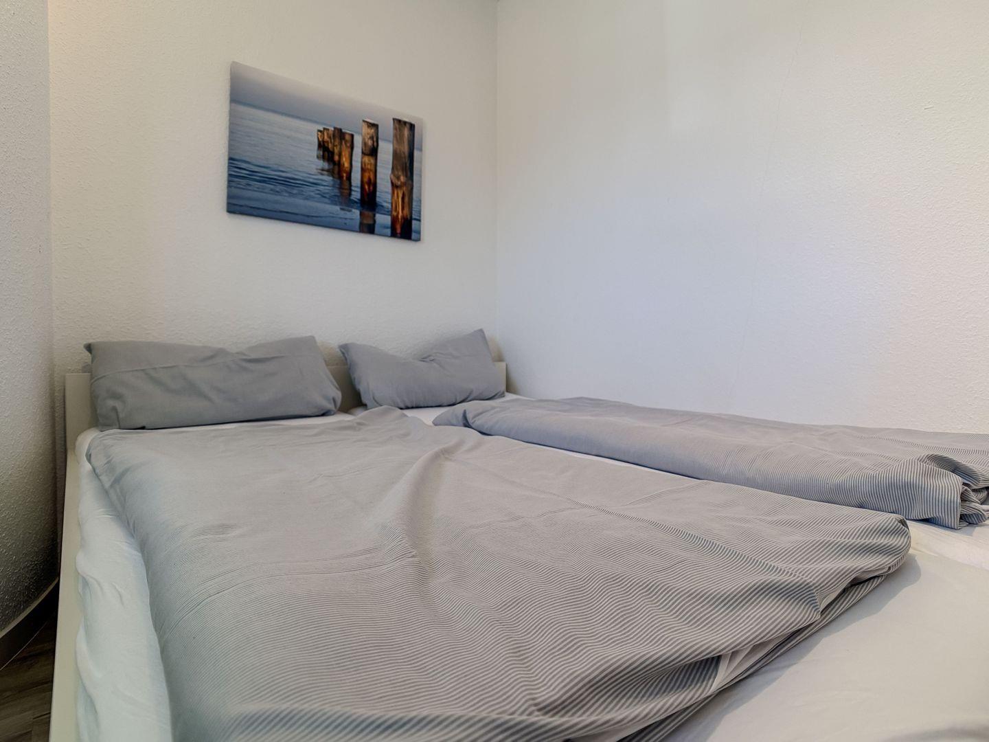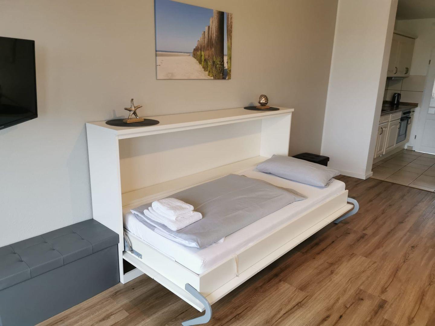 Das separate Schlafzimmer mit komfortablem Doppelbett verspricht erholsame Nächte, während ein modernes Schrankbett im Wohnzimmer eine zusätzliche Schlafgelegenheit bietet.