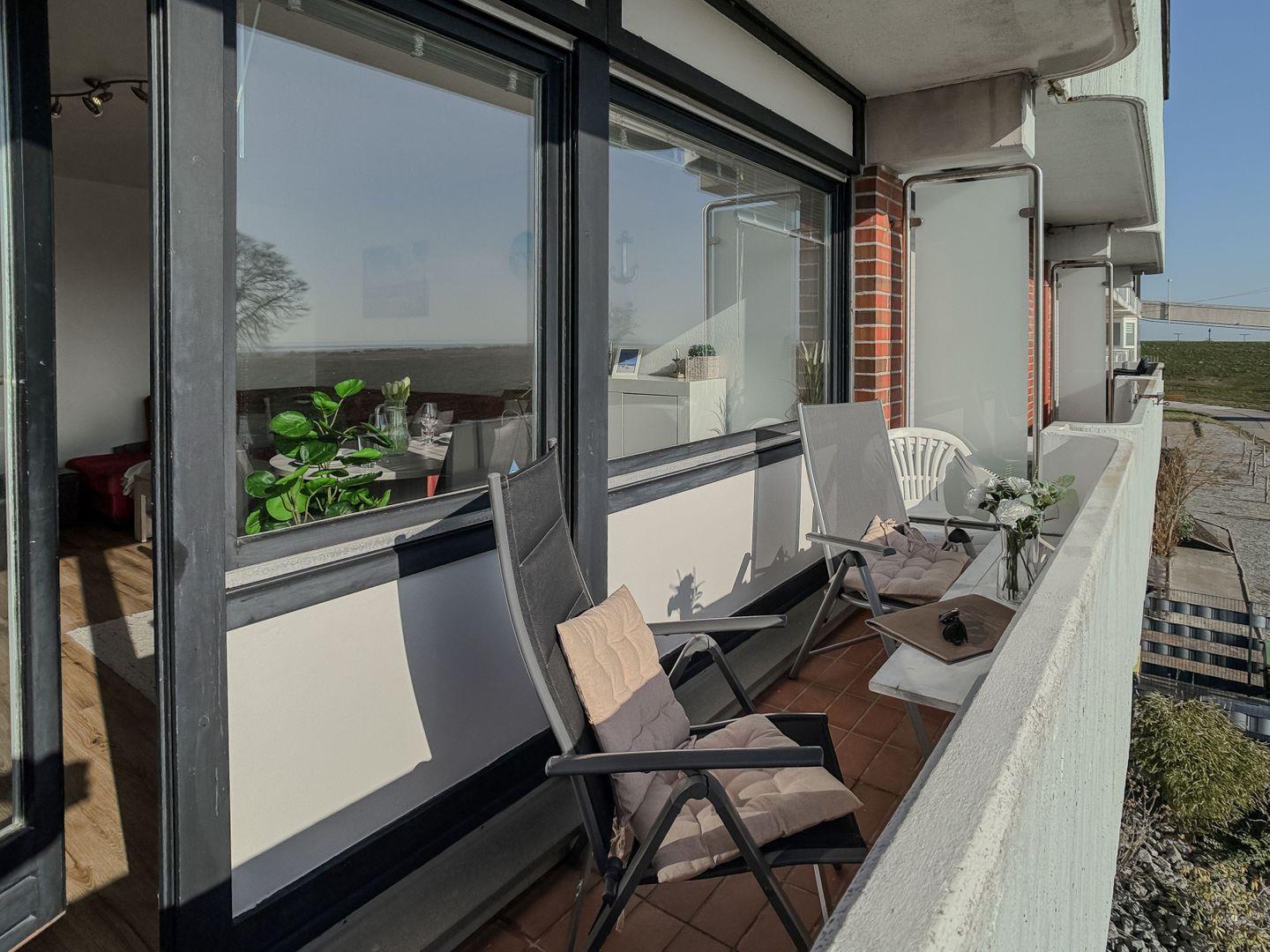 Ein ganz besonderes Highlight: Vom Esstisch und vom sonnigen Balkon genießen Sie einen einzigartigen Ausblick über den Deich bis hin zum Wattenmeer und Sandstrand – Urlaubsmomente, die in Erinnerung bleiben.