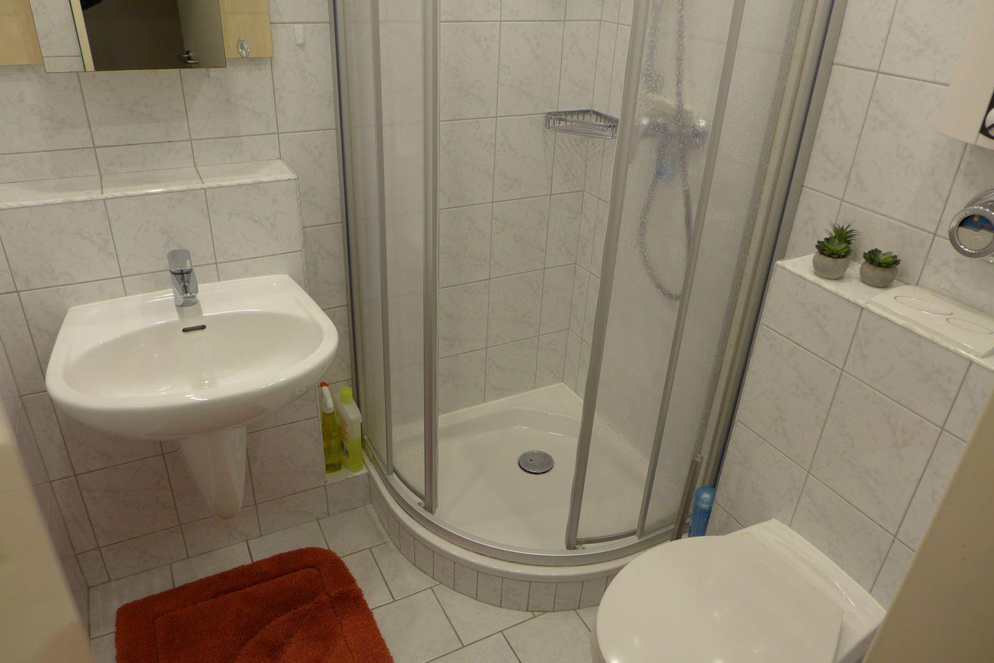 Eine moderne Küche ist mit Spülmaschine, Cerankochfeld, Backofen mit integrierter Mikrowelle und allen erforderlichen E-Geräten, z. B. Wasser- , Eierkocher und Toaster, Porzellan, Gläsern sowie Tischwäsche ausgestattet. Ferner gibt es ein neues Duschbad. Im Flur befindet sich ein Einbaukleiderschrank. Die Ferienwohnung ist mit einer Zentralwarmwasser-Elektroheizung (keine Nachtspeicherheizung) ausgestattet.