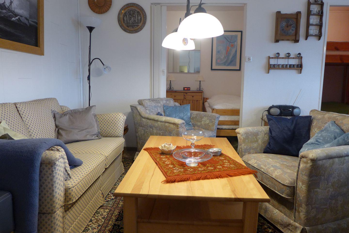 Diese wunderschöne 45m² - Ferienwohnung befindet sich im 1. Stock (Aufzug). Die geschmackvoll eingerichtete und sehr helle Wohnung verfügt über insgesamt 2 Schlafräume mit jeweils 2 Betten. Ein gemütlicher Wohnbereich sowie eine hochwertige Essgruppe, HD-TV-Flachbildschirm sowie Radio-/ CD-Player und Kinderhochstuhl runden das Bild ab. Bücher und Gesellschaftsspiele - alles ist da.