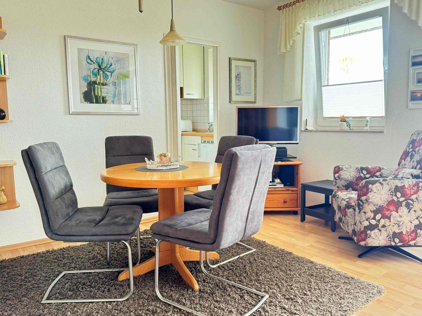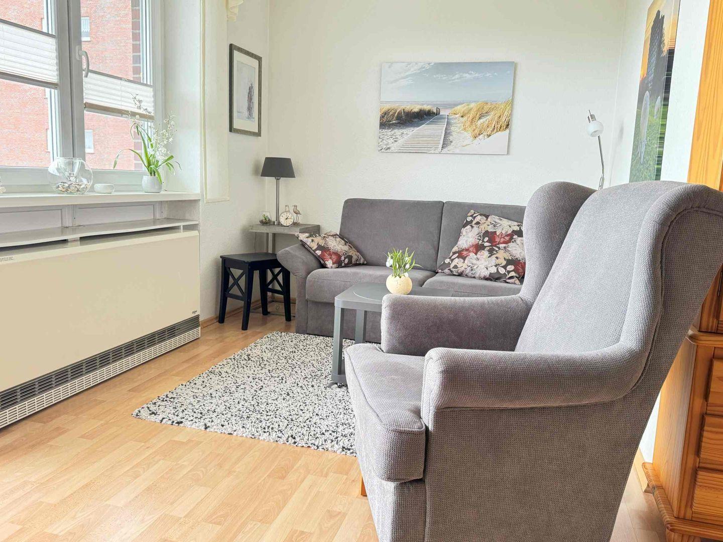 Im Wohnzimmer befindet sich eine neue Schlafcouch, 2 neue Sessel, Flachbild-TV, CD-Radio, viele Bücher und Gesellschaftsspiele.