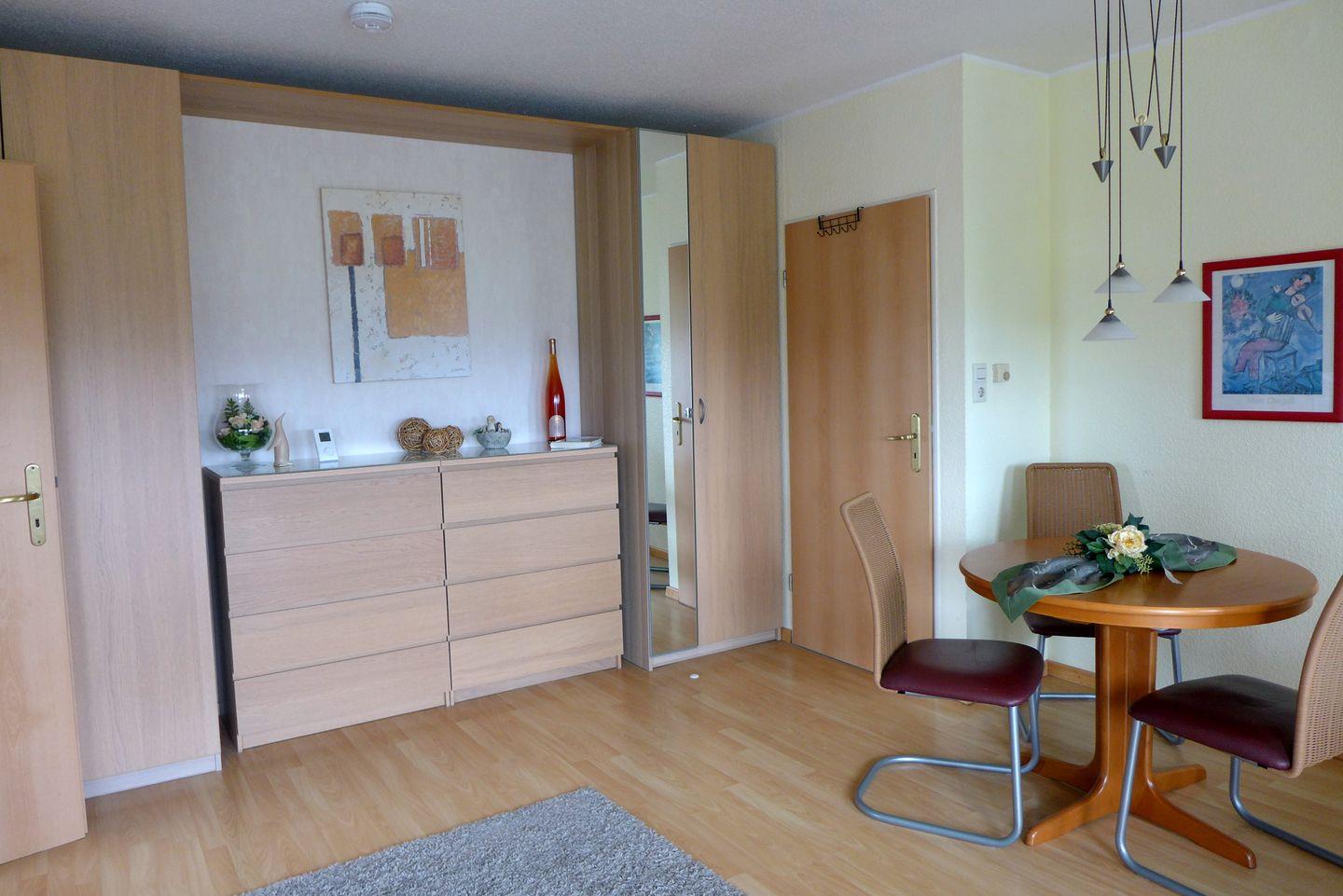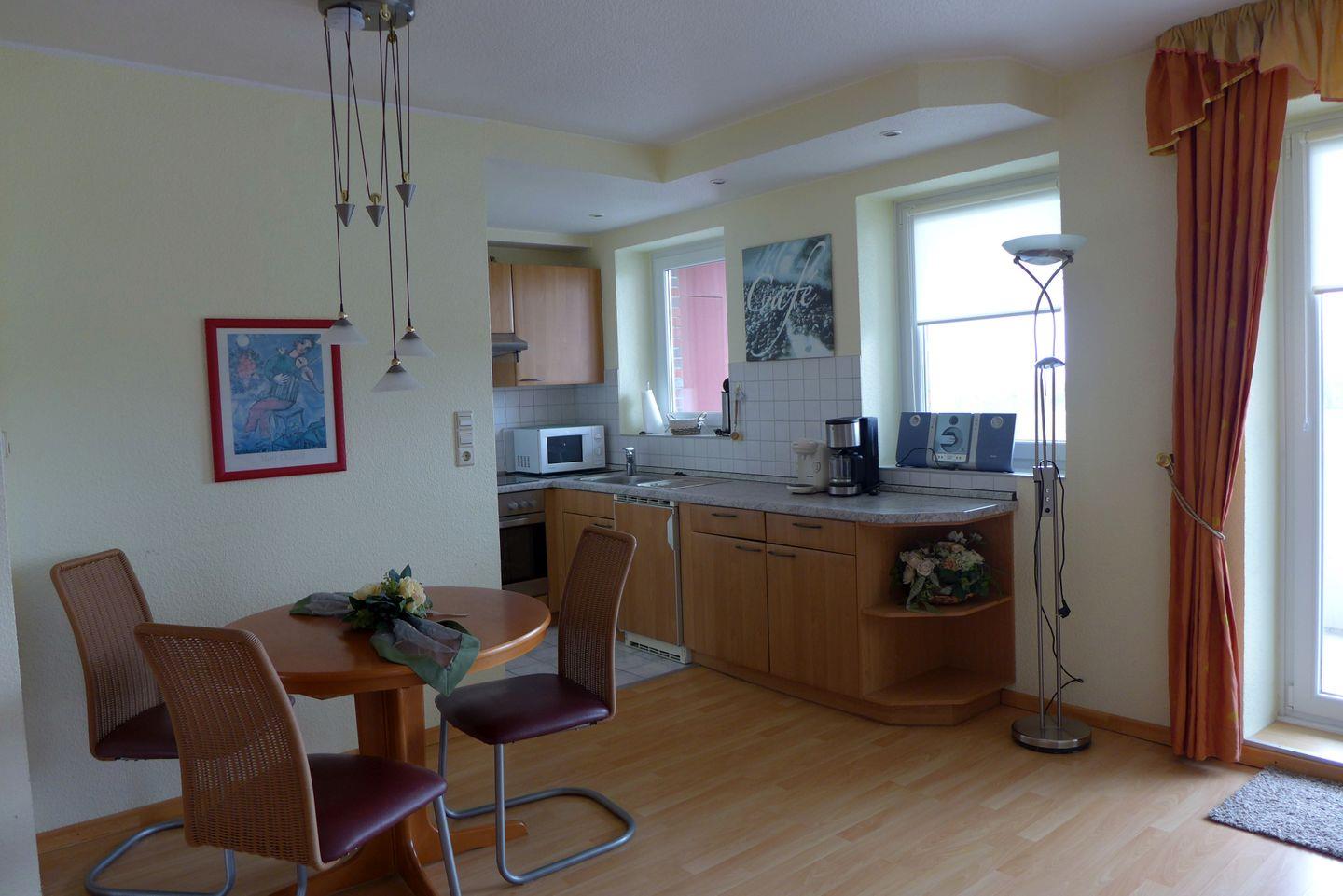 Das Wohnzimmer mit offener Küche, einem Essbereich und einer großen Wohnlandschaft lädt zum verweilen ein. Geeignet ist die Wohnung für 2 Personen.