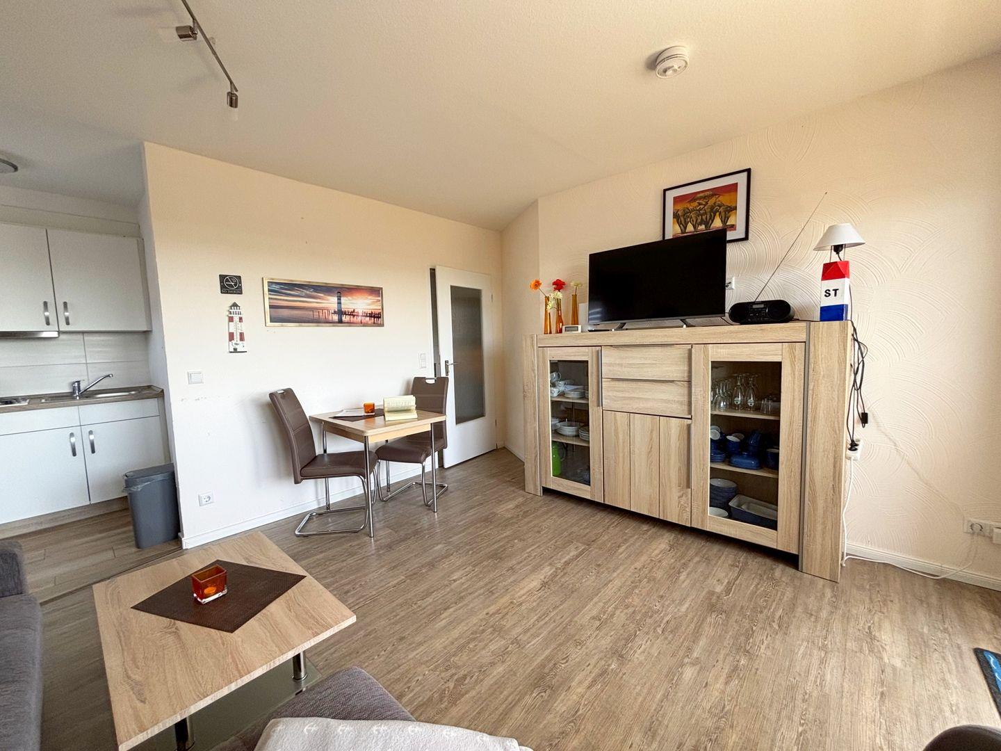 Das Wohnzimmer mit offener Küche, einem extra Essbereich und einer schönen Wohnlandschaft laden zum entspannen ein. Die Küche ist modern und zweckmäßig mit Mikrowelle mit Grill, Senseo-Kaffeemaschine, Kaffeemaschine und Wasserkocher eingerichtet.