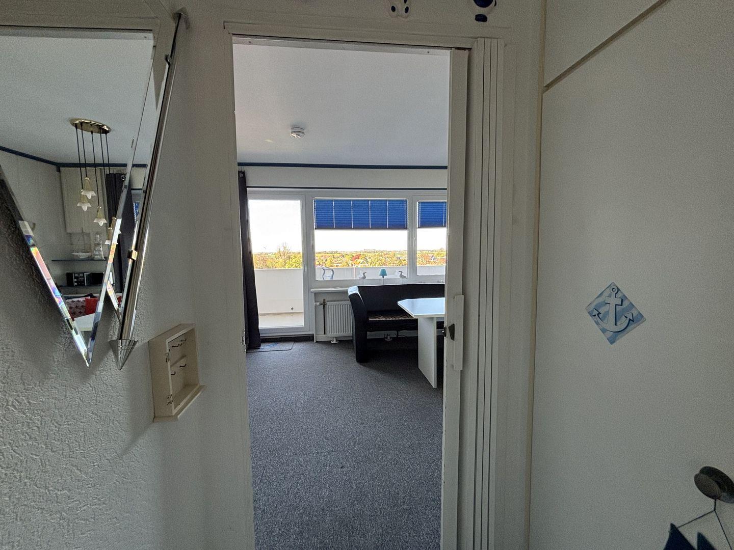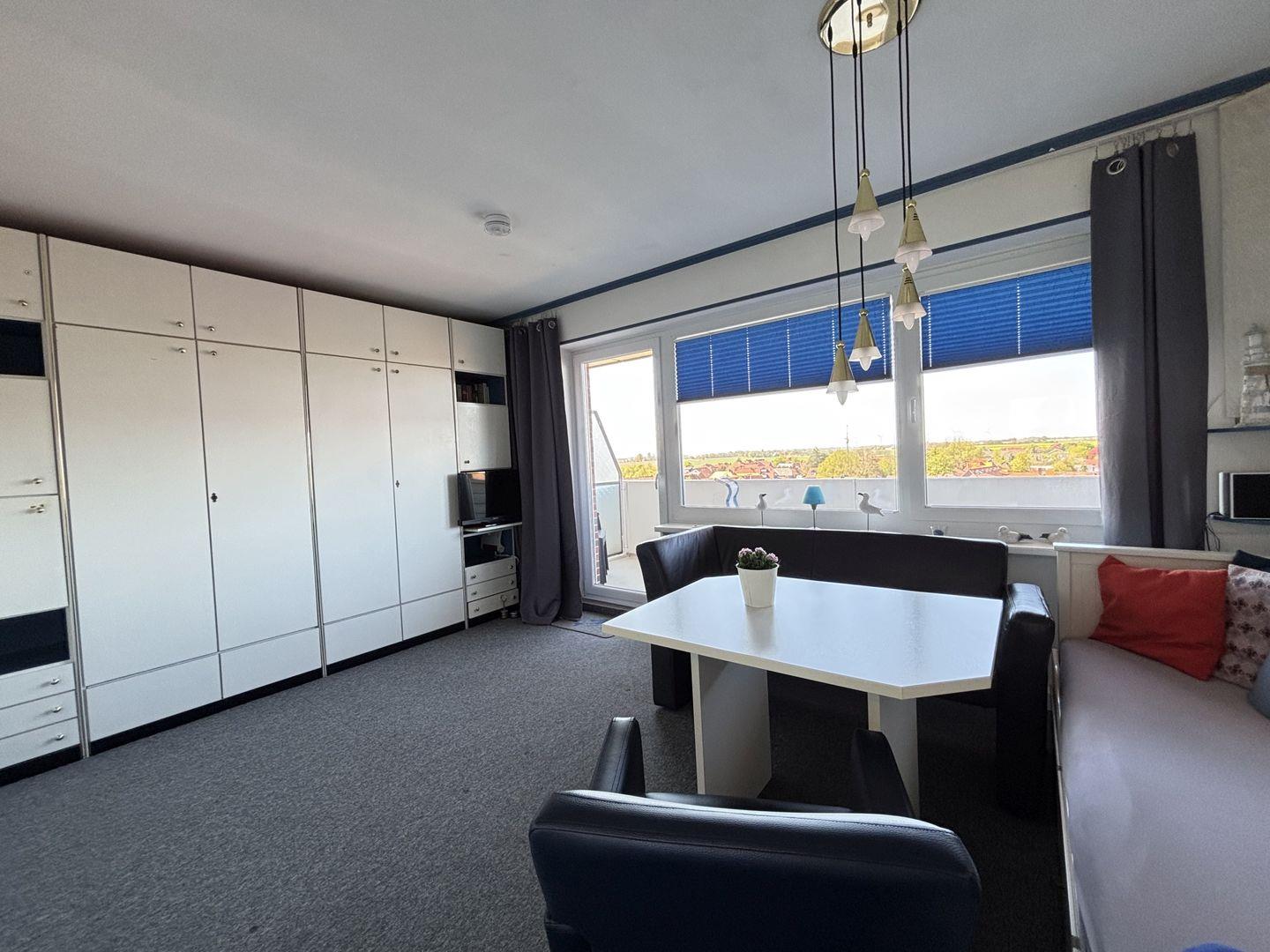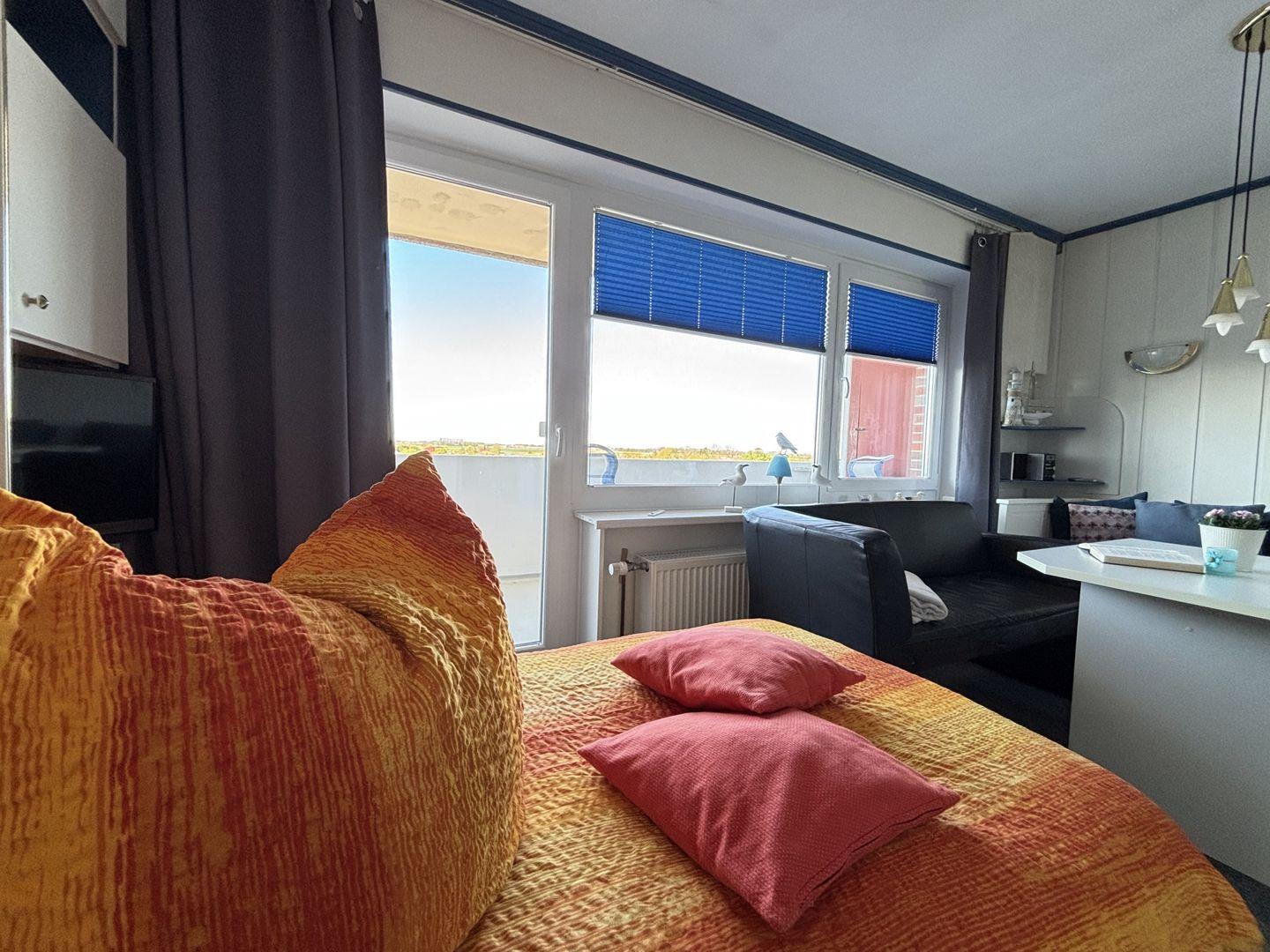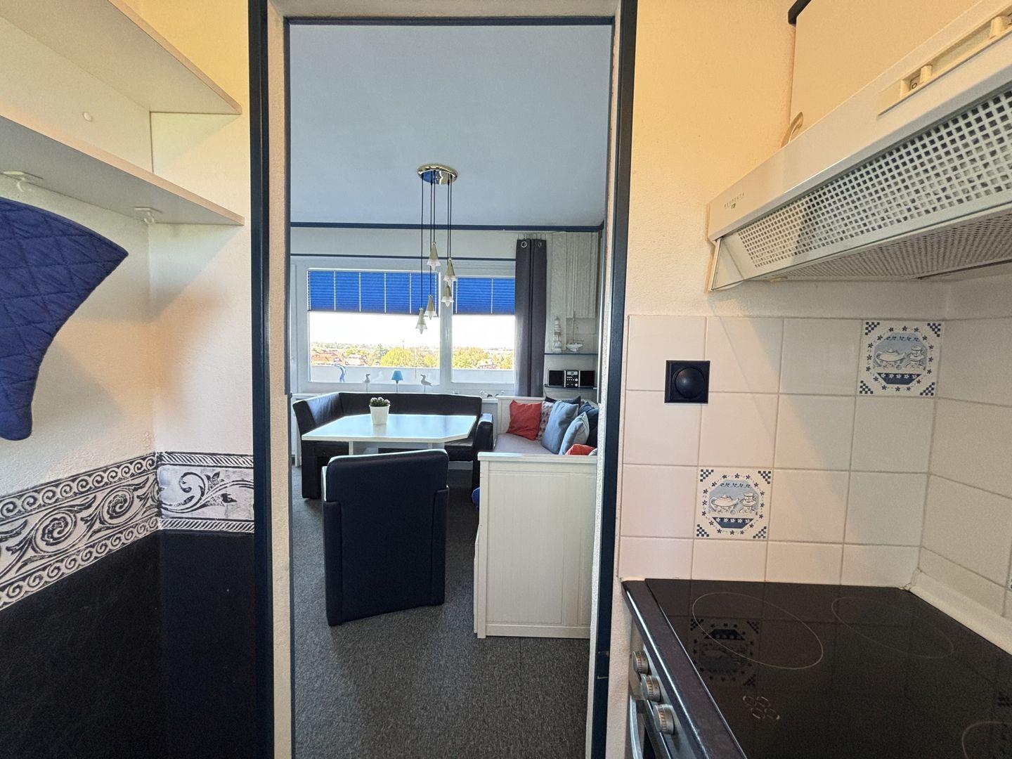 Diese helle und freundliche Wohnung befindet sich im 5`ten Stock, mit dem Fahrstuhl gut zu erreichen. Es ist ein kombinierter Wohn und Schlafraum, der eingerichtet ist mit einem Doppelschrankbett, einem Einzelbett, einer Sitzecke, einem Fernsehsessel und einem TV-Flachbilschirm. Die Küche ist mit einem 4 Platten Ceranfeld, mit Backofen und dazugehörigem Geschirr und Besteck ausgestattet.