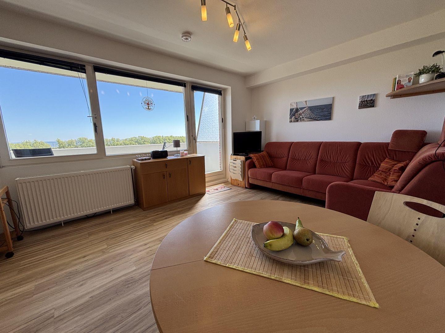 Diese kleine Einzimmer- Wohnung mit tollem Meerblick, befindet sich im 6`ten Stock. Sie ist mit dem Fahrstuhl einfach zu erreichen. Im Wohnzimmer ist ein ausklappbares, doppeltes Schrankbett, eine gemütliche Sofaecke mit Flachbildfernseher und ein Esstisch mit Stühlen.