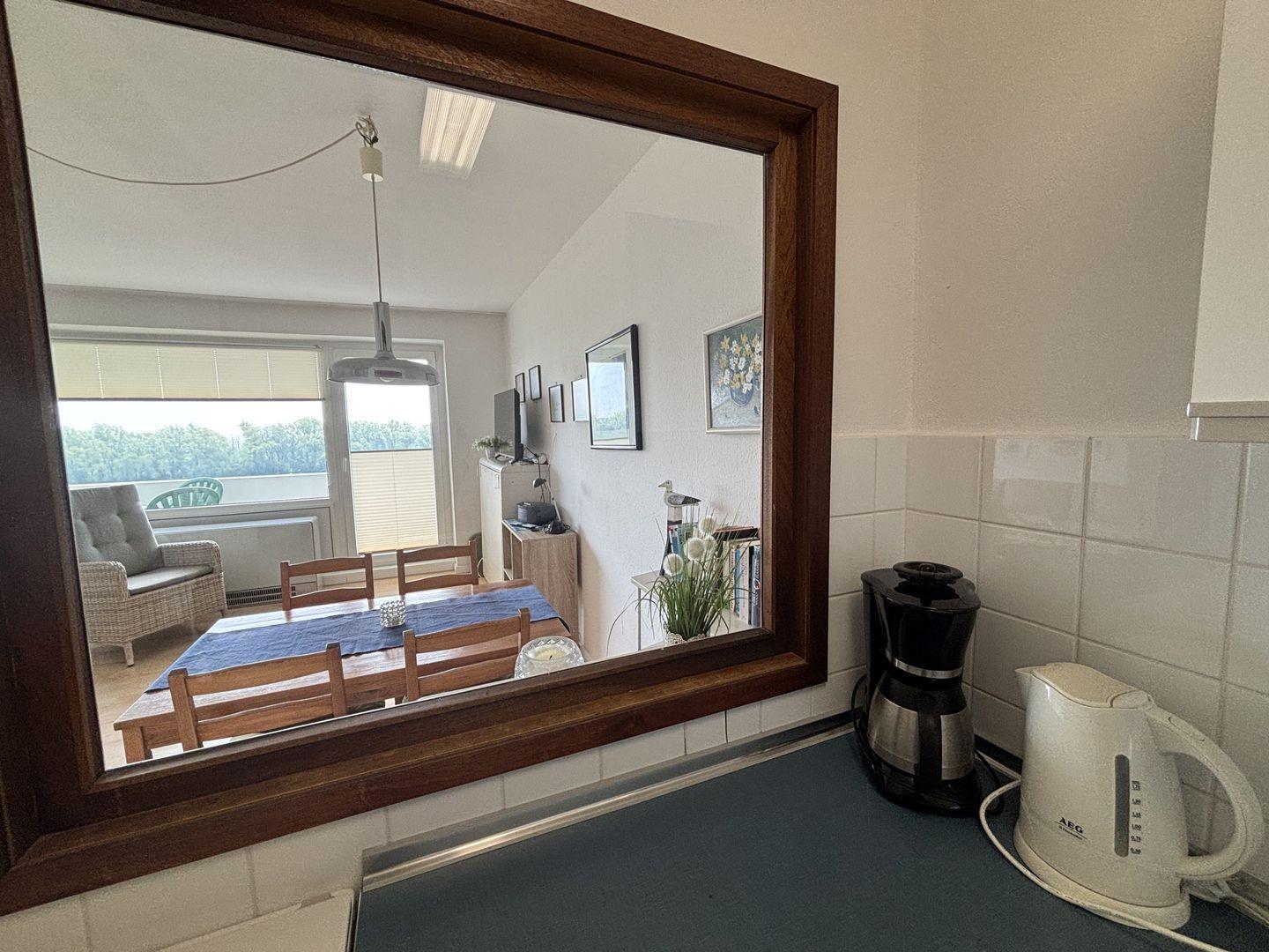 Die Einrichtung ist einfach und praktisch mit einer separaten Küche die einen Backofen und vier Platten Herd beinhaltet. Der Clou, von der Küche aus hat man durch ein großes Fenster den Blick ins Wohnzimmer, die mit einer Essecke und einer Fernsehecke ausgestattet ist.