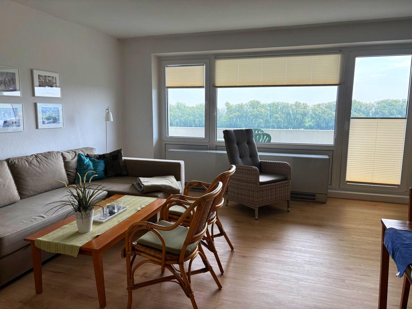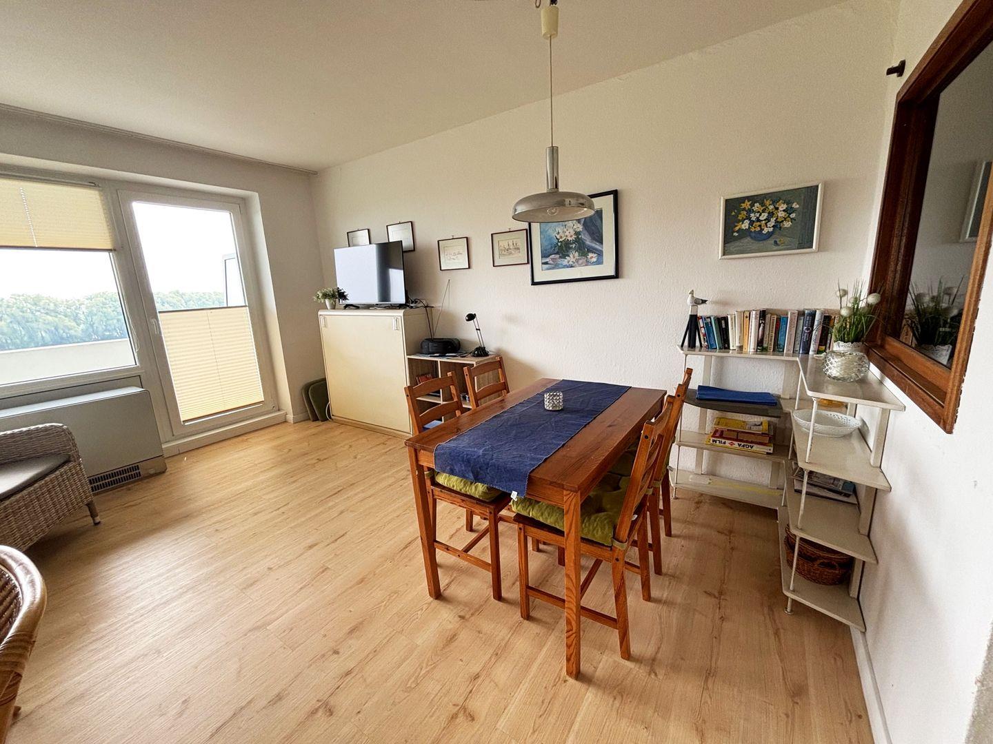 Diese schlichte und einfache Wohnung liegt in der 6. Etage mit Balkon und einem herrlichen Blick zum Meer.