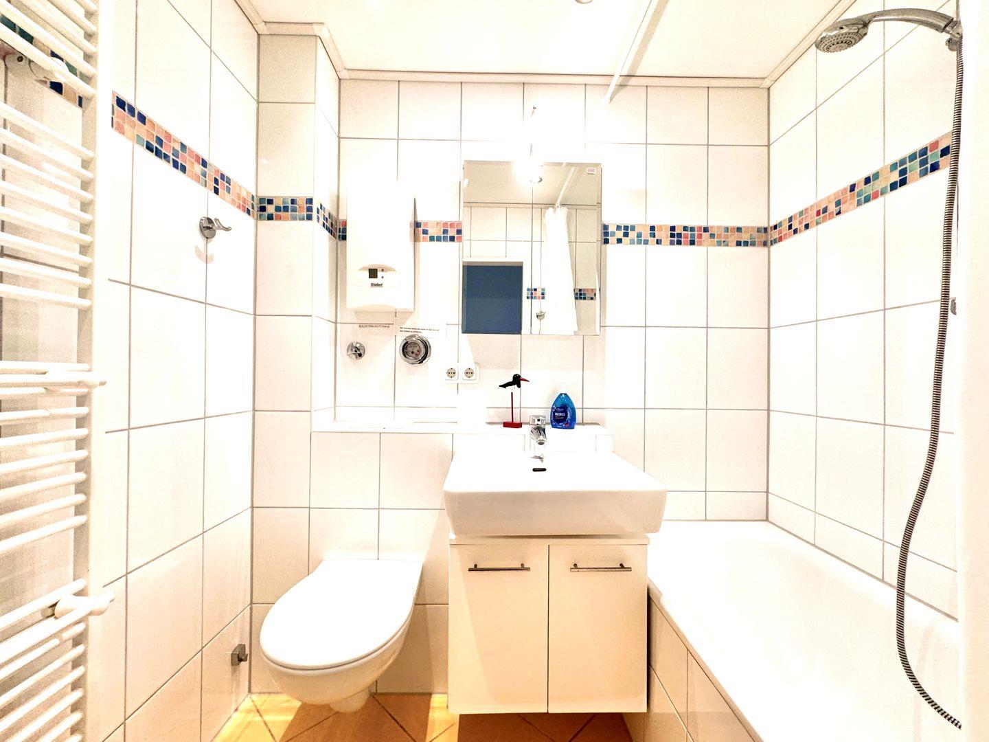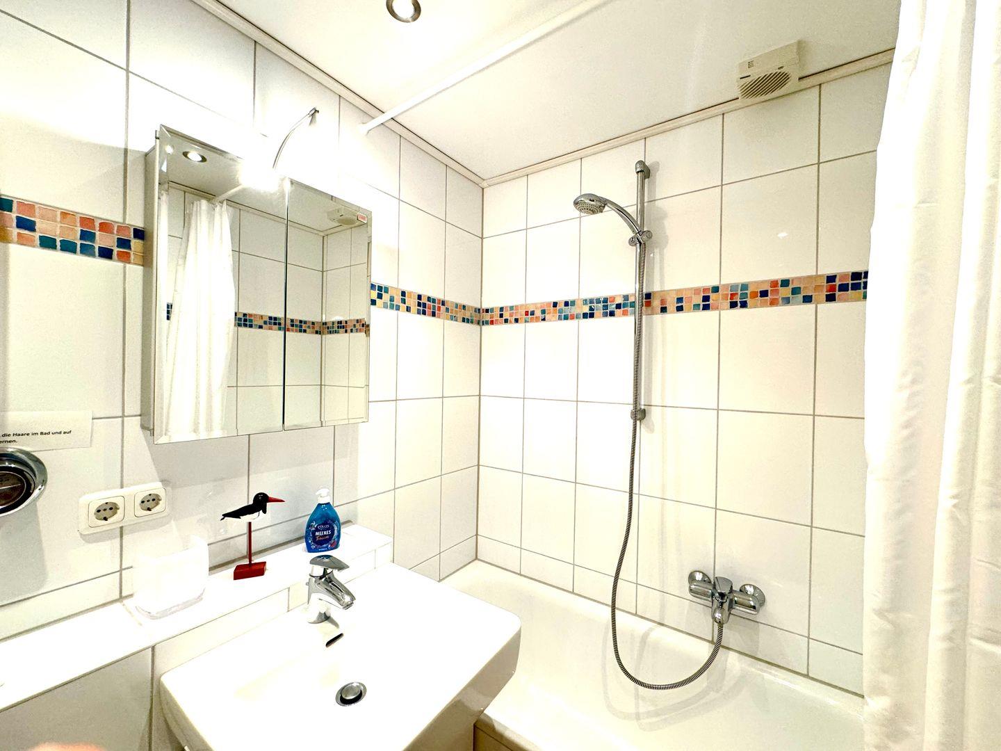Das Badezimmer verfügt über eine Badewanne mit Dusche.