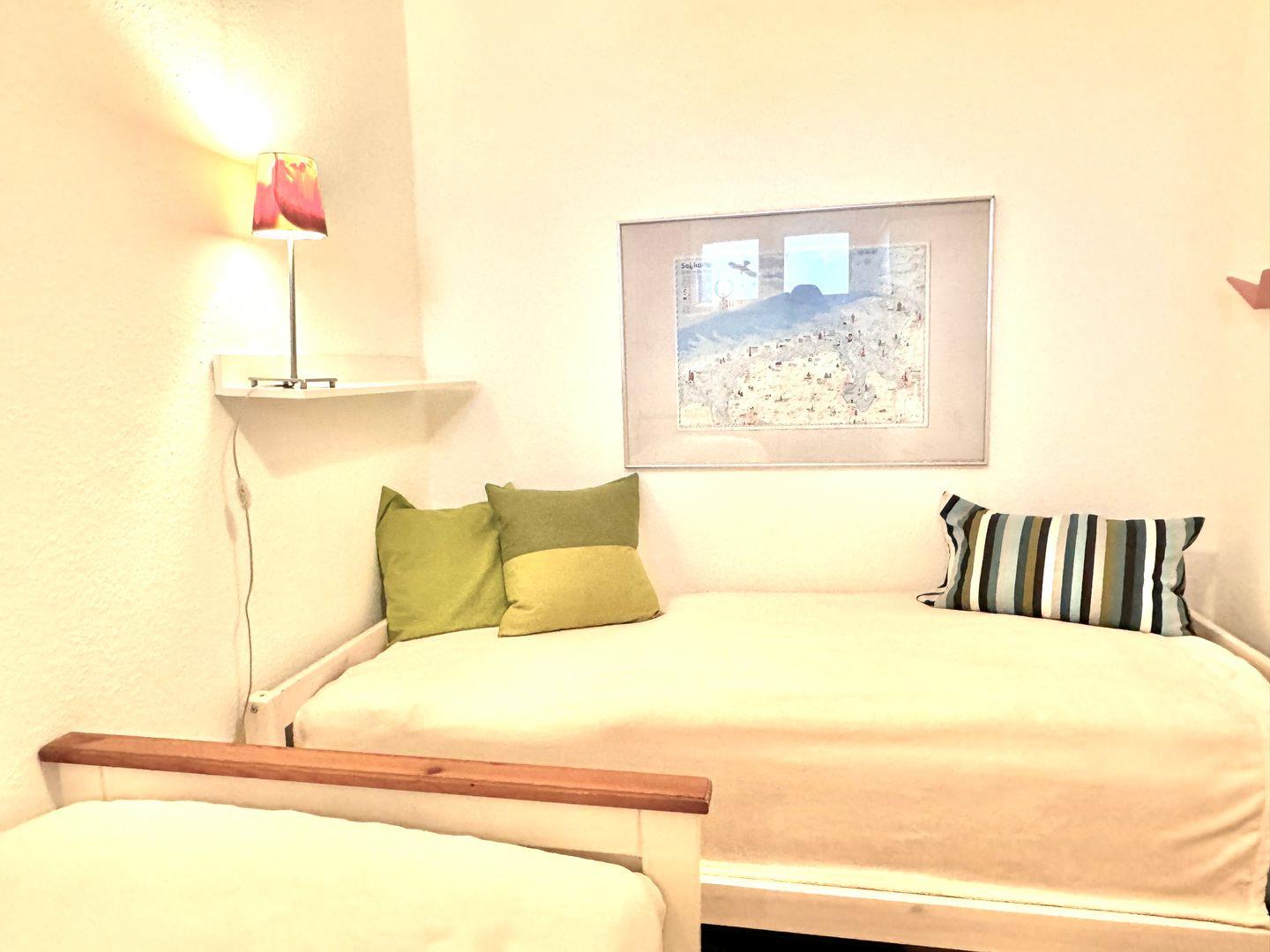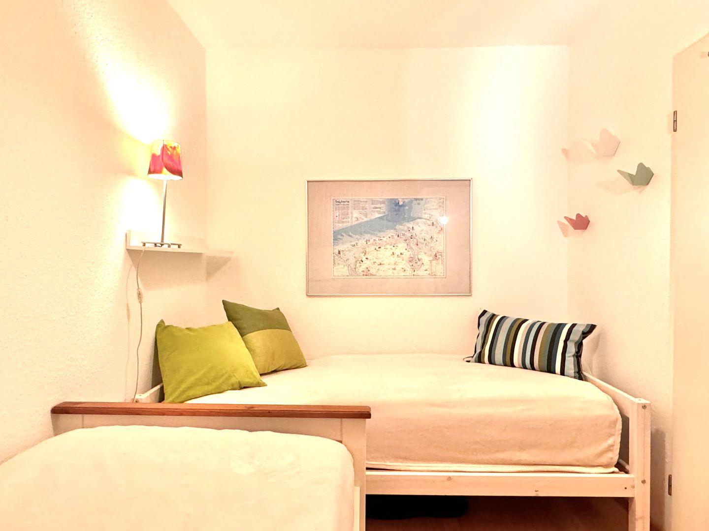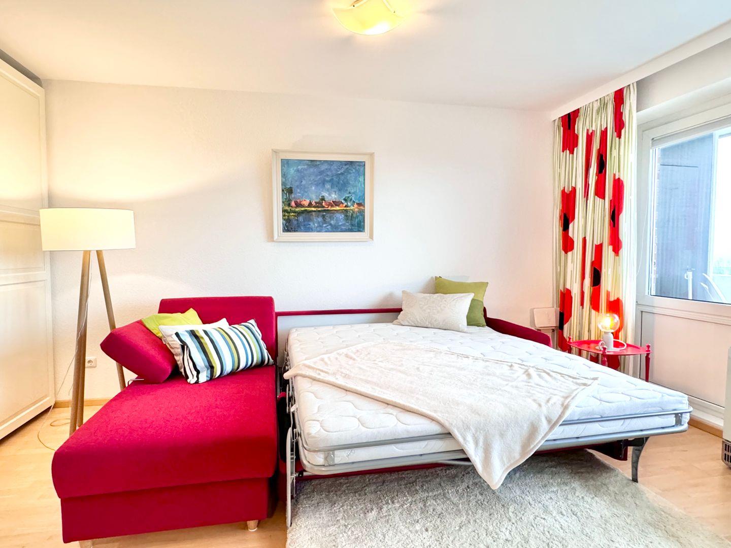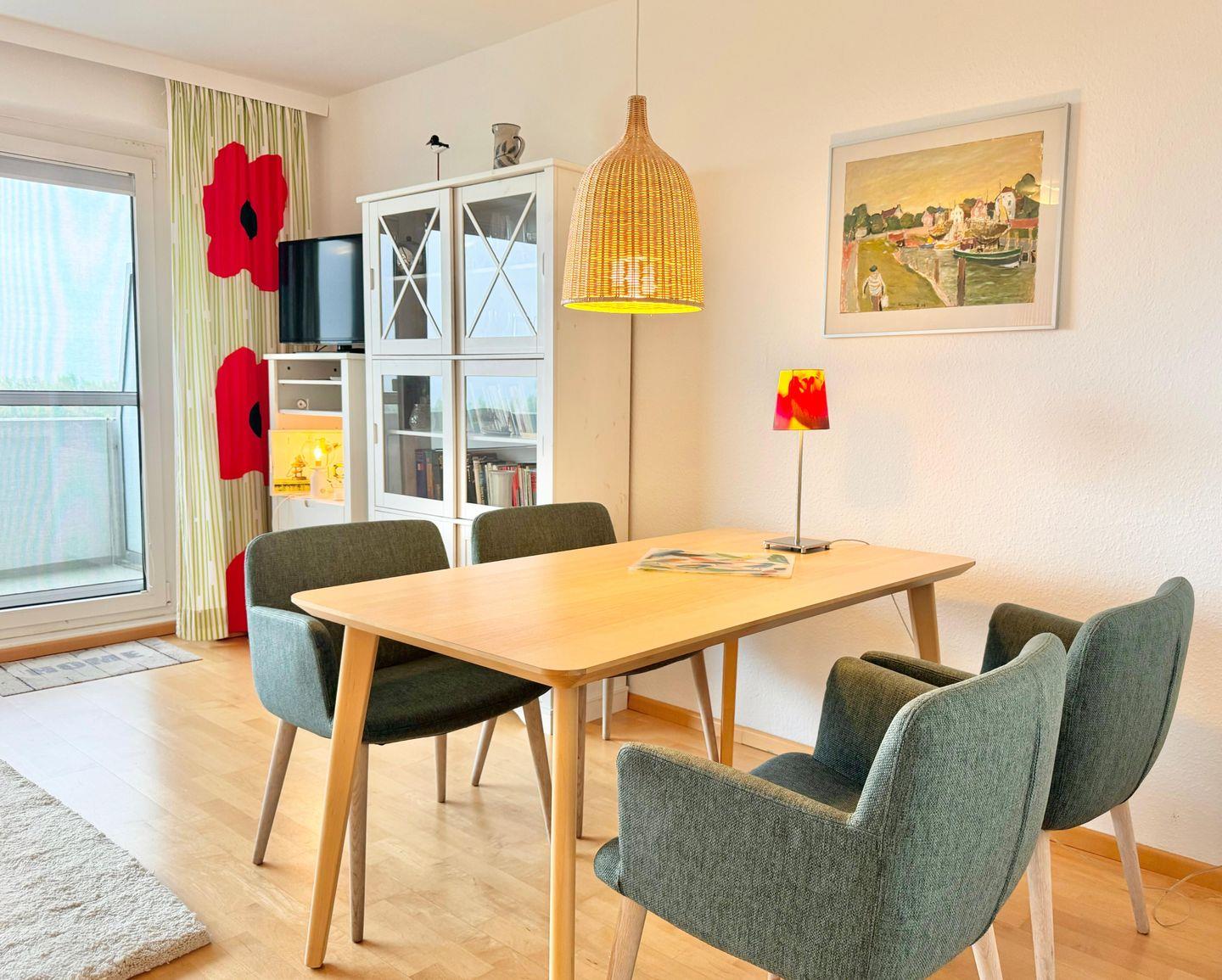 Zu der 2-Zimmer-Ferienwohnung (47 qm) gehört ein großer Balkon mit Süd-Ost-Ausrichtung. Das Wohn-Esszimmer ist mit zwei Sofa-Federkern-Betten ausgestattet, die sich auch zu einem Doppelbett(160x200 cm,) arrangieren lassen. Im Schlafzimmer gibt es zwei Einzelbetten. Damit die Sonne Sie nicht zu früh weckt, gibt es Verdunklungsrollos. Kostenfreies WLAN ist selbstverständlich vorhanden, dazu ein TV sowie ein Radio-CD-Player.