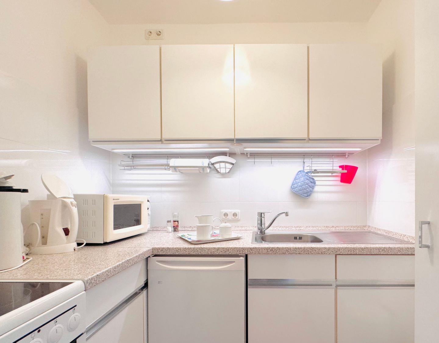 Die Küche ist ausgestattet mit Ceran-Kochfeld, Backofen, Mikrowelle, Toaster, Kaffeemaschine und allen notwendigen Küchenutensilien.