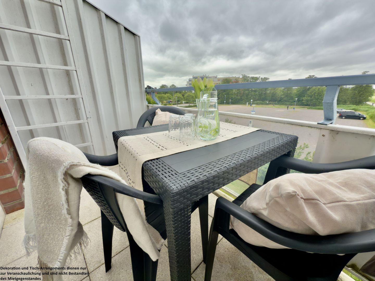 Das angrenzende, lichtdurchflutete Wohnzimmer lädt mit seinem gemütlichen Sofa zu entspannten Abenden ein – sei es bei einem guten Buch, einem Film oder einfach beim Lauschen der Wellen in der Ferne. Die integrierte Essgruppe bietet den idealen Platz für gemeinsame Mahlzeiten oder lustige Spieleabende. Von hier aus gelangen Sie direkt auf den wunderschönen Balkon, wo Sie die frische Nordseeluft genießen und den Blick über das Meer schweifen lassen können.