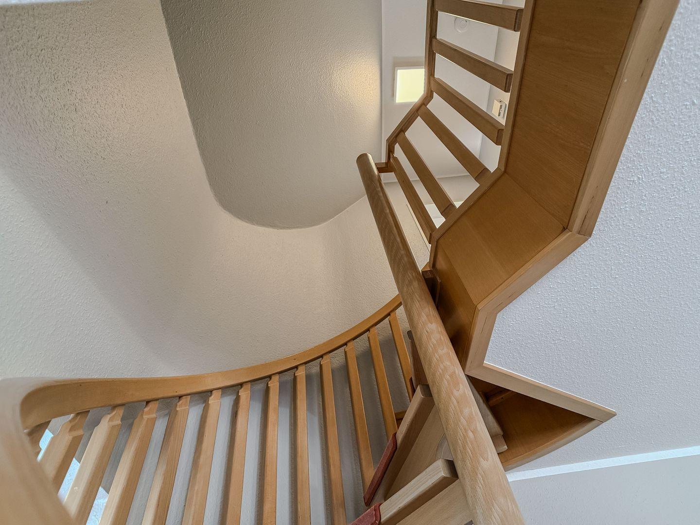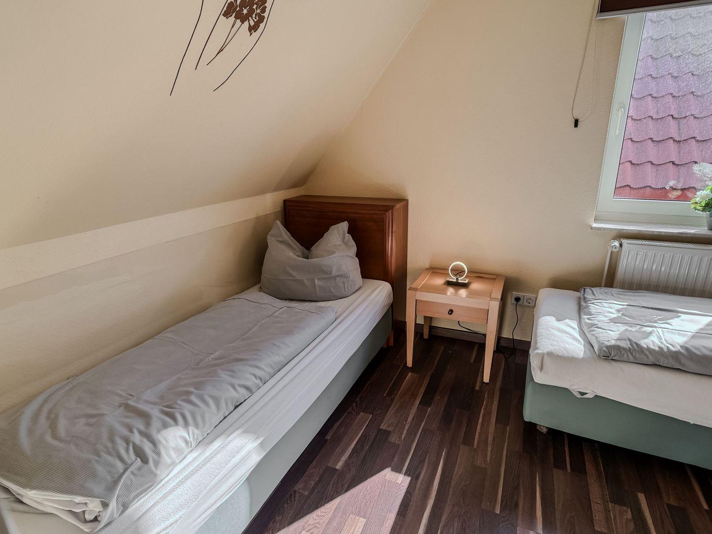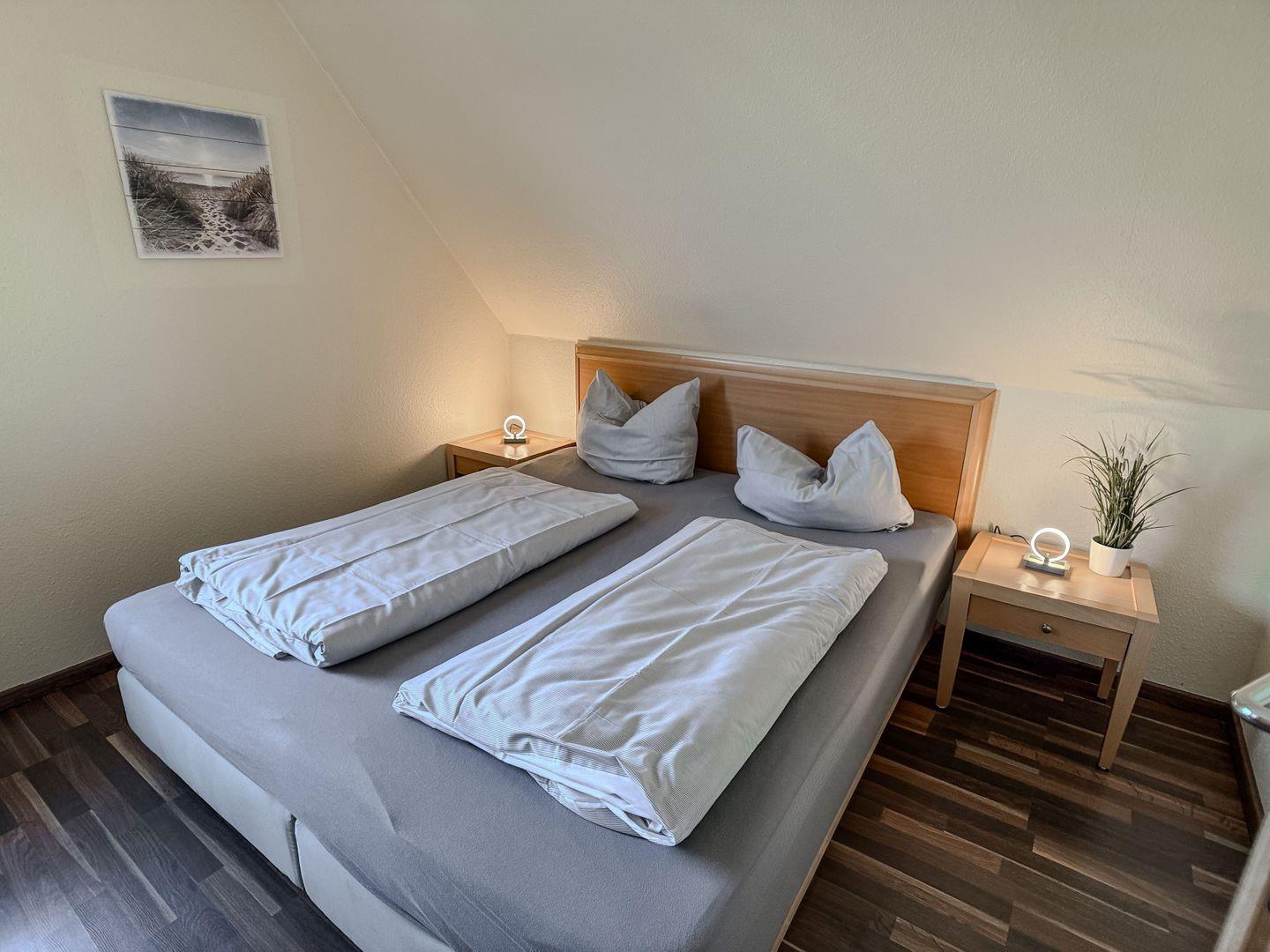 Über eine stabile Holztreppe im Wohnzimmer erreichen Sie die obere Etage, in der sich die beiden liebevoll eingerichteten Schlafzimmer befinden. Das erste Schlafzimmer verfügt über ein gemütliches Doppelbett (2x 90x200Matratzen) und einen geräumigen Kleiderschrank, während im zweiten Schlafzimmer zwei Einzelbetten (90x200) bereitstehen – ideal für Kinder oder mitreisende Freunde. Alle Räume lassen sich für eine erholsame Nachtruhe verdunkeln.