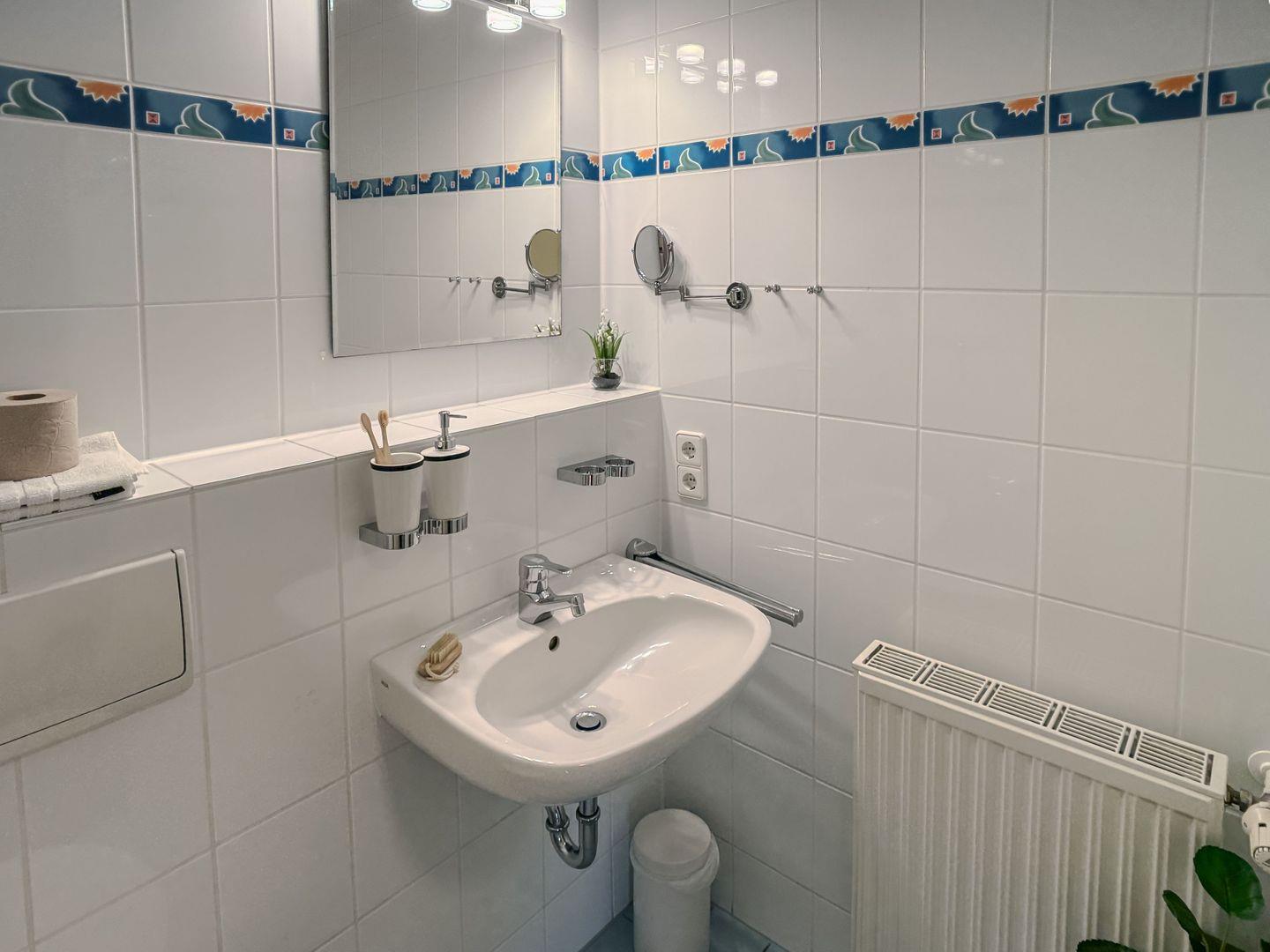 Das moderne, hell geflieste Badezimmer bietet ausreichend Platz für Ihre tägliche Pflege und sorgt mit seiner freundlichen Atmosphäre für einen angenehmen Start in den Tag.