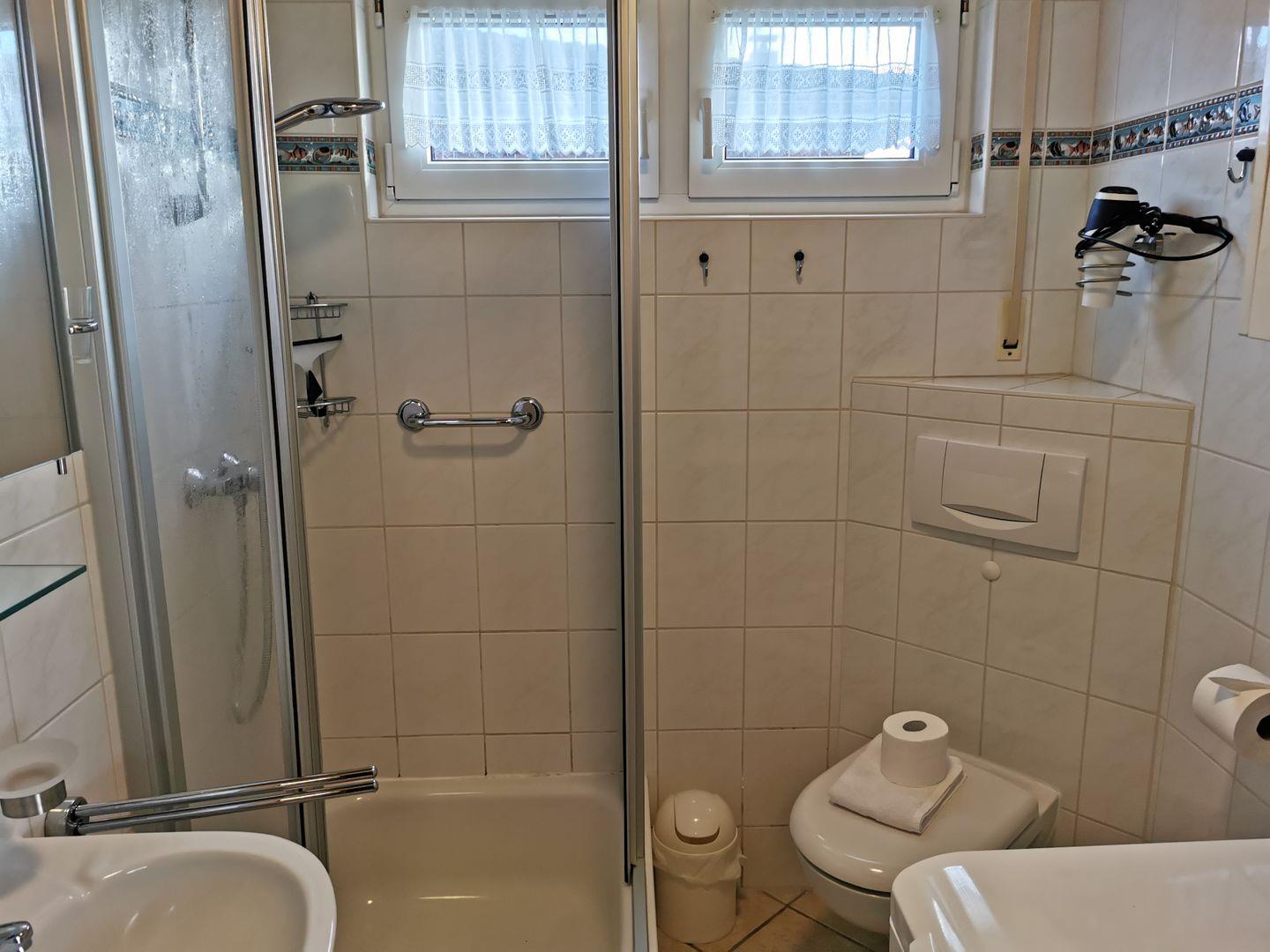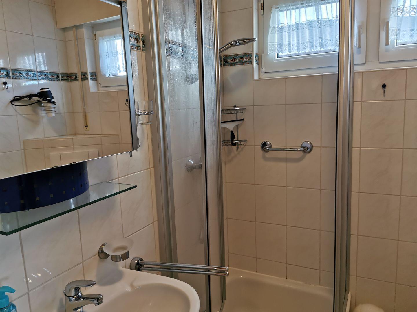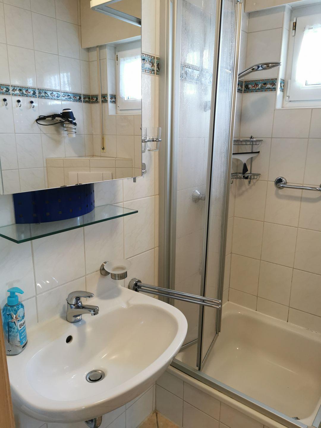 Das hell und freundlich geflieste Badezimmer verfügt über eine Dusche und einen Spiegel.