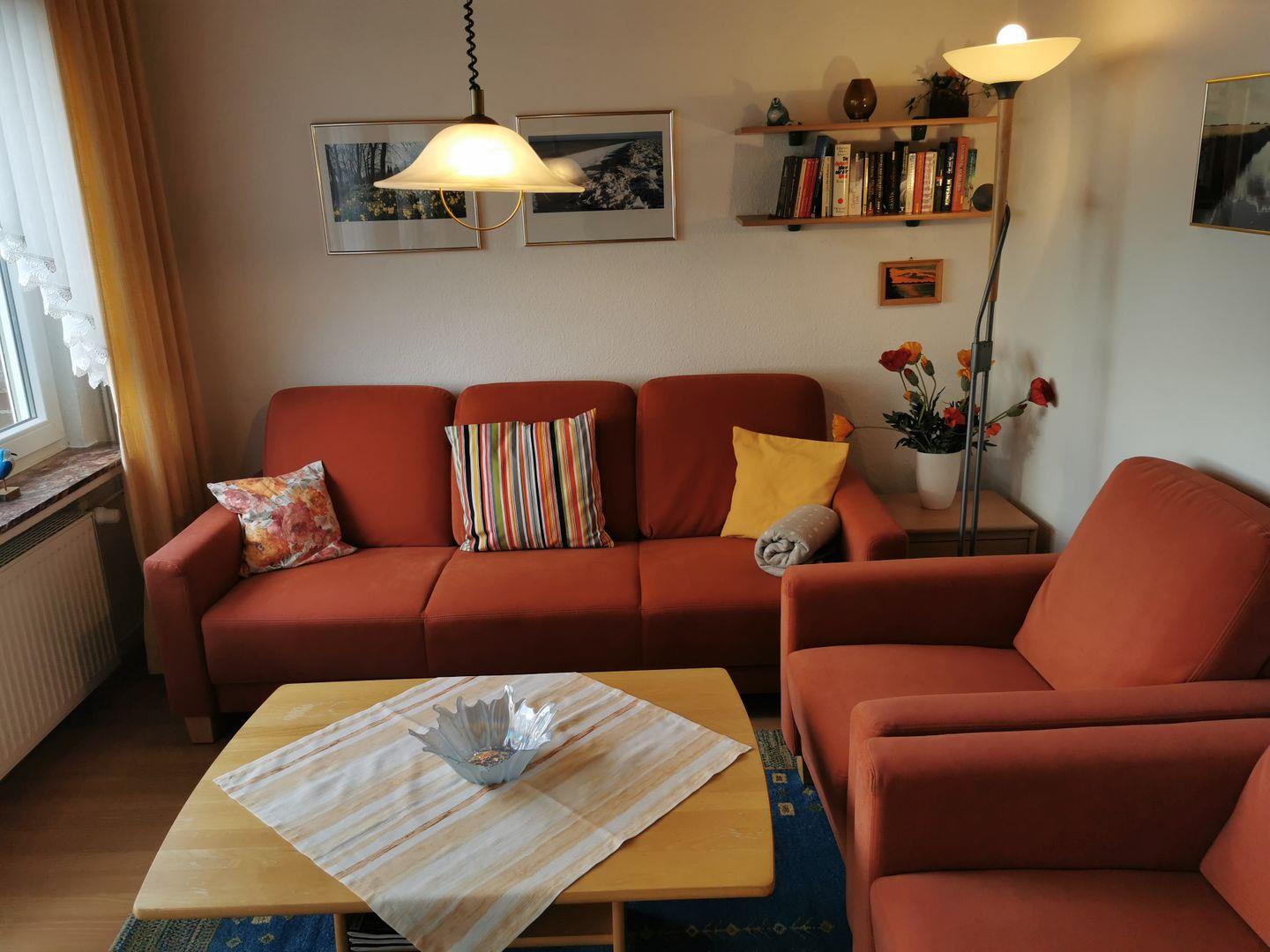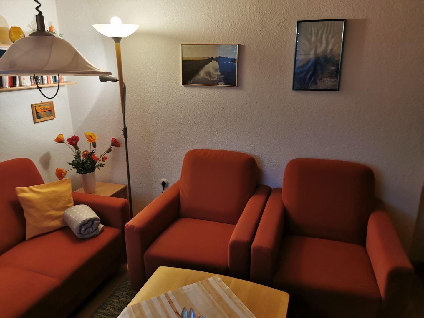 Ein gemütliches Sofa sowie zwei Sessel die sich im Wohnzimmer befinden, laden zum gemütlichen Entspannen ein.
