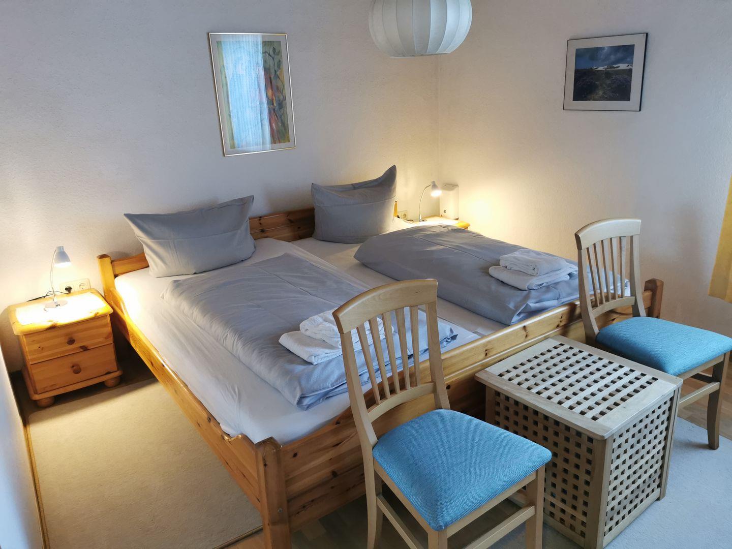 Der geräumige zweite Schlafraum ist mit einem Doppelbett und einem Kinderbett ausgestattet.