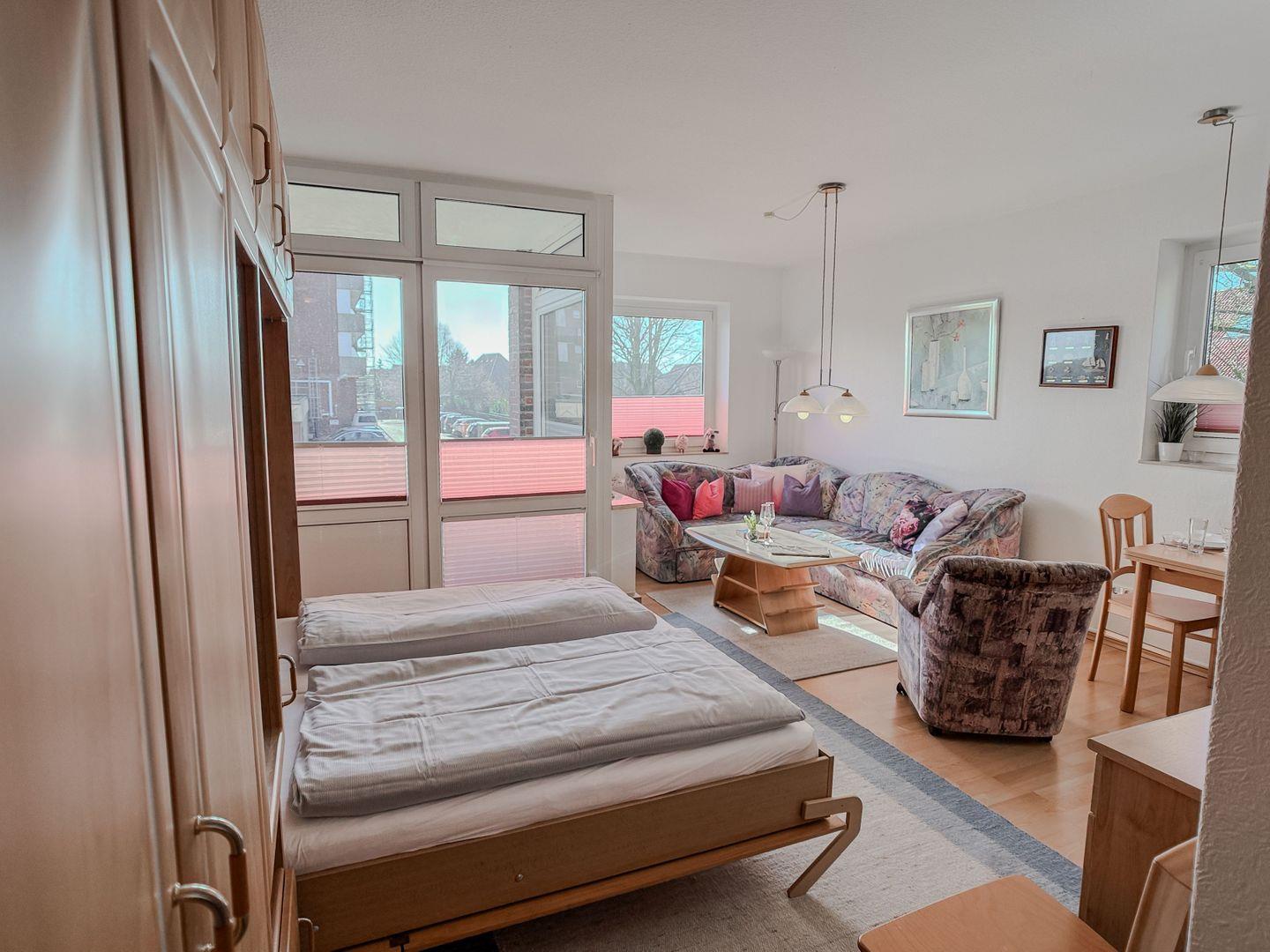 Der helle und freundliche Wohnbereich ist das Herzstück dieser Unterkunft, geprägt von großen Fenstern, die die Sonne hereinrufen und eine warme Atmosphäre schaffen. Das im Wohnzimmer befindliche Schrankbett (80x200 Matratzen) bietet tagsüber viel Platz und verwandelt sich nachts in eine gemütliche Schlafstätte für zwei Personen. Die großzügige Sofalandschaft lädt zu entspannten Abenden ein, während die kleine, aber feine Essecke den perfekten Platz für gemeinsame Mahlzeiten bietet.
