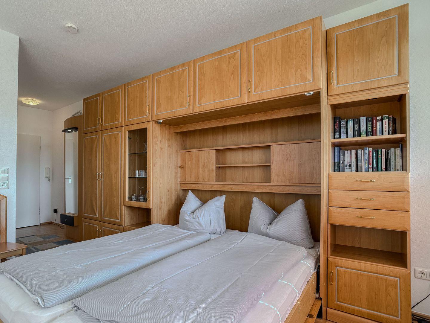 Der helle und freundliche Wohnbereich ist das Herzstück dieser Unterkunft, geprägt von großen Fenstern, die die Sonne hereinrufen und eine warme Atmosphäre schaffen. Das im Wohnzimmer befindliche Schrankbett bietet tagsüber viel Platz und verwandelt sich nachts in eine gemütliche Schlafstätte für zwei Personen. Die großzügige Sofalandschaft lädt zu entspannten Abenden ein, während die kleine, aber feine Essecke den perfekten Platz für gemeinsame Mahlzeiten bietet.
