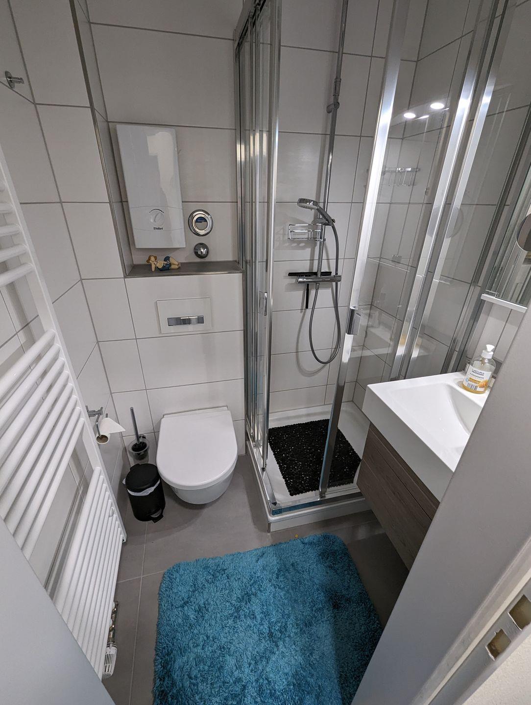 Alle Fenster sind mit hochwertigen Plissees ausgestattet, um Ihnen Privatsphäre und Schutz vor zu viel Sonneneinstrahlung zu bieten. Ein Parkplatz steht Ihnen zur Verfügung, und im Erdgeschoss des Gebäudes finden Sie neben dem Haupteingang Zugang zu Waschmaschine und Trockner, die bequem mit 1€-Münzen bedient werden können.