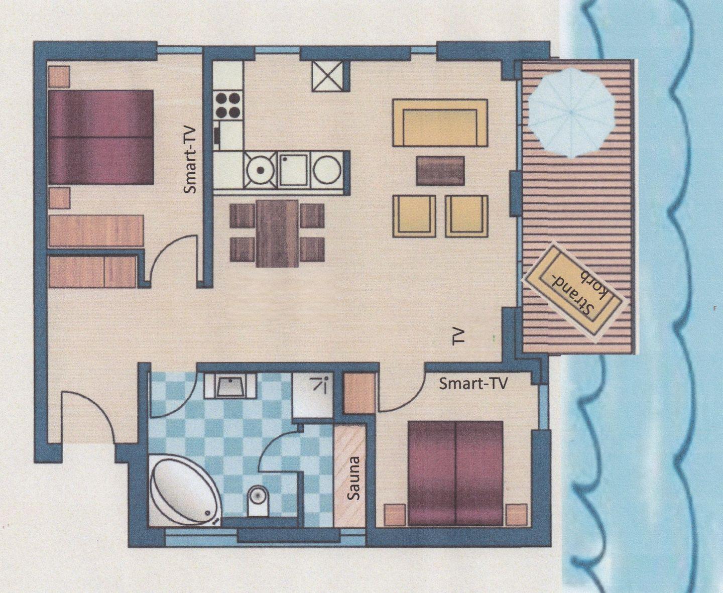 Der Balkon bietet Euch einen direkten Blick auf das Wasser der Graft. Lasst hier die Seele baumeln und genießt traumhafte Sonnenuntergänge. Der Tisch mit bequemen Stühlen, ein Sonnenschirm und ein traditioneller Strandkorb sorgen für zusätzlichen Komfort. Spürt die frische Meeresbrise auf Eurer Haut und lasst den Tag in aller Ruhe ausklingen. Und das Beste: Die Wohnung liegt im Erdgeschoss, sodass Ihr barrierearmen Zugang zu allen Annehmlichkeiten haben werdet.