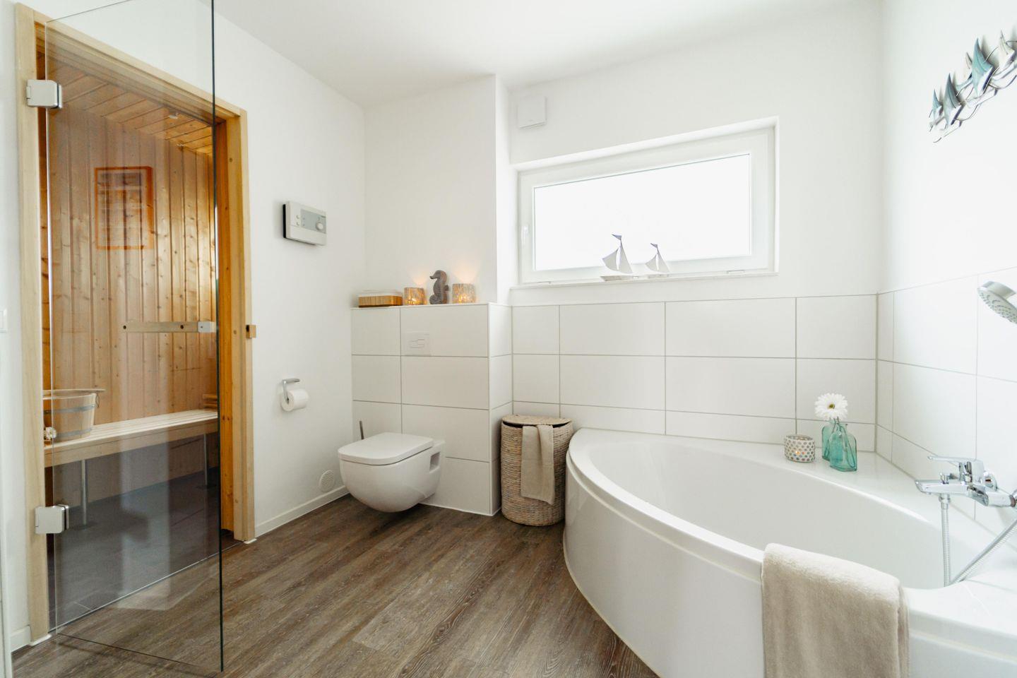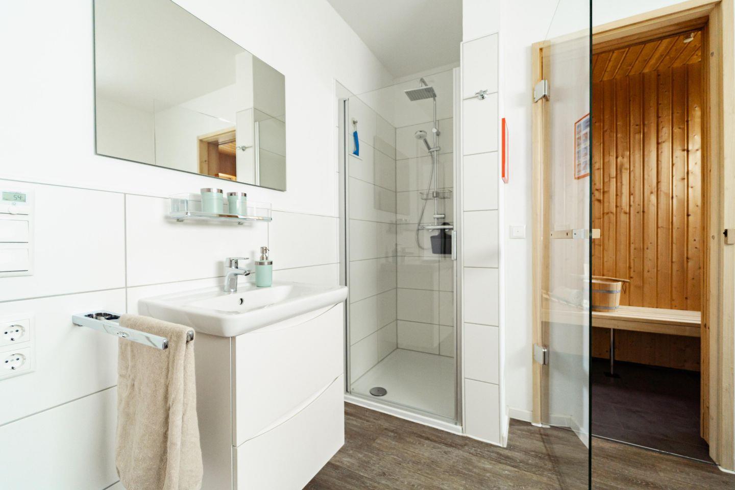 Das Badezimmer der Ferienwohnung bietet Euch eine private Sauna – Euer ganz persönlicher Wellnessbereich, sodass Ihr Euch jederzeit einen privaten Sauna-Abend genießen könnt. Gönnt Euch einen entspannenden Saunagang und fühlt, wie der Alltagsstress von Euch abfällt. Eine große Badewanne und eine leicht zugängliche Dusche runden das Wellness-Erlebnis ab.