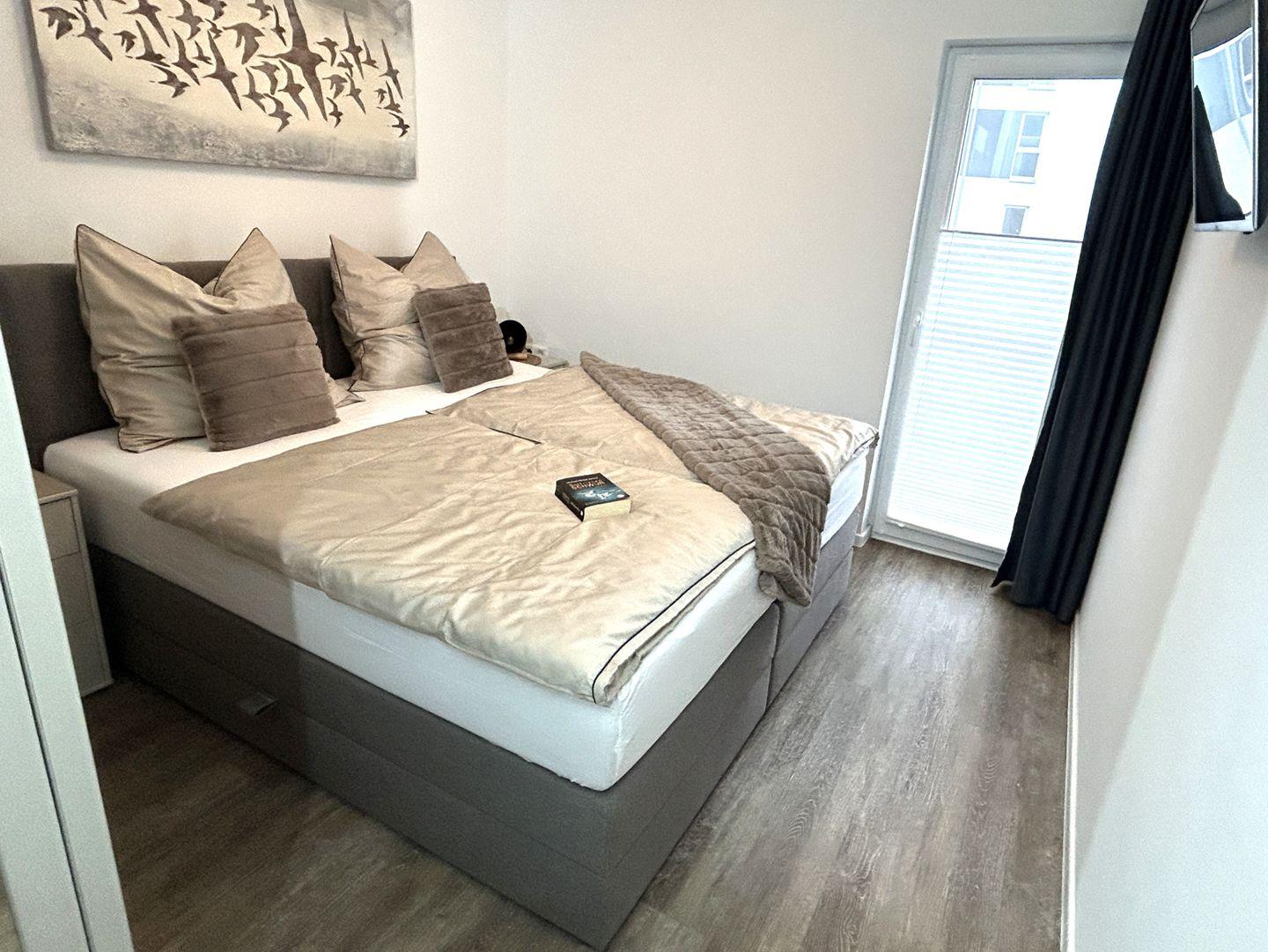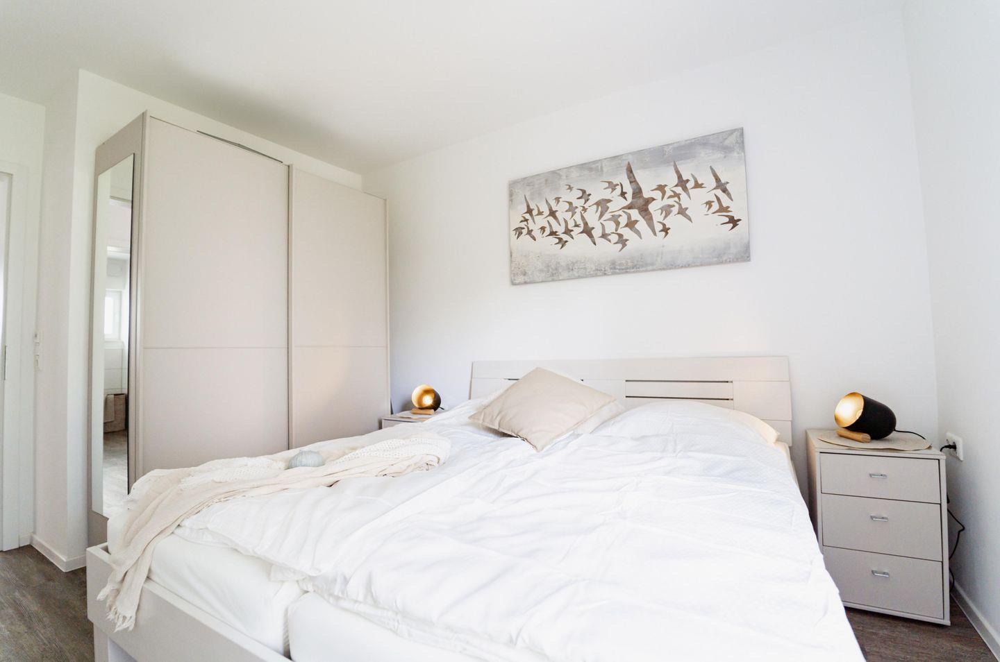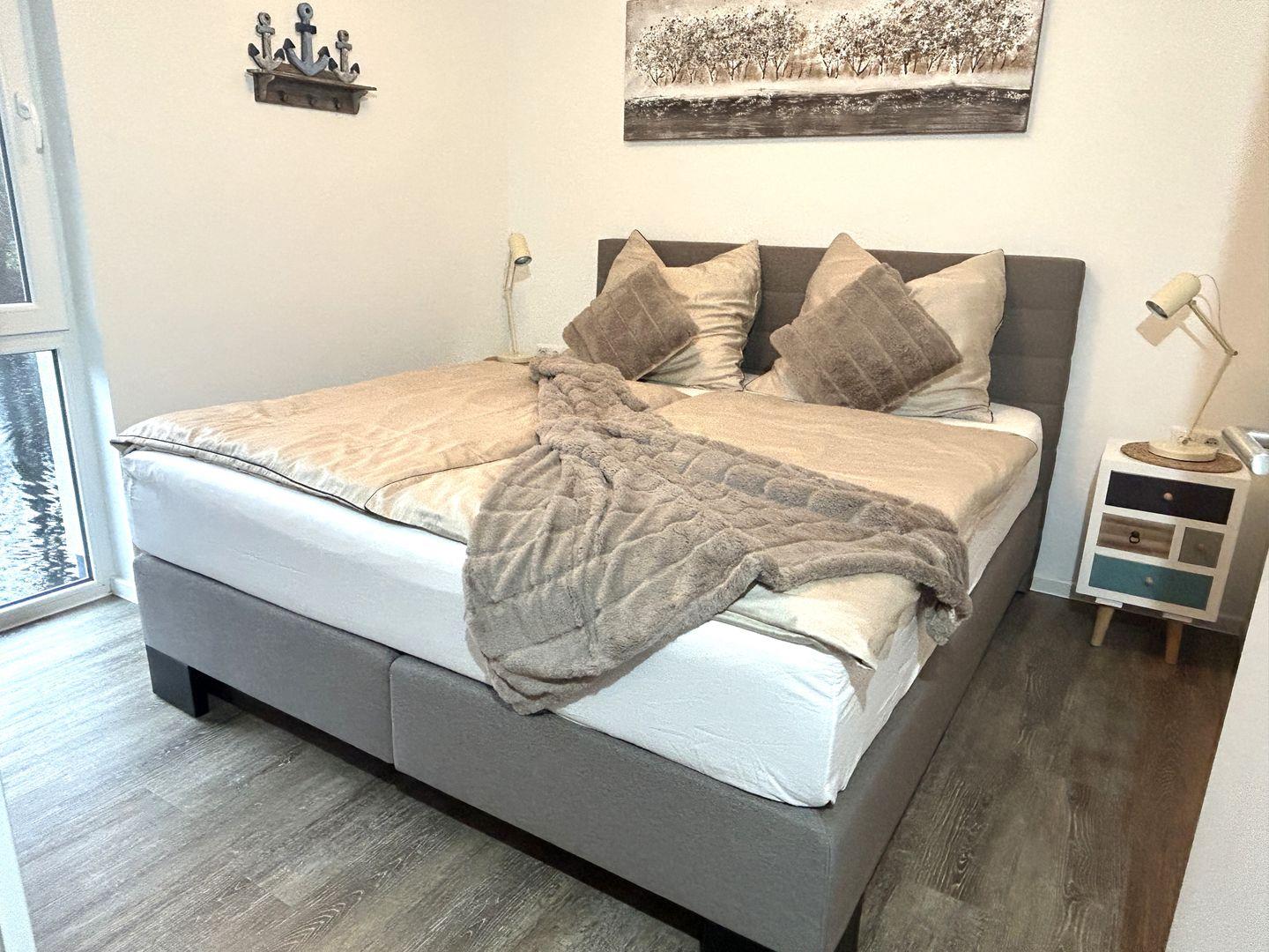 Unsere Ferienwohnung verfügt über zwei Schlafzimmer, die mit großen Boxspringbetten (1,80 x 2,00 m durchgehender Topper) und großzügigen Kleiderschränken ausgestattet sind. Hier findet Ihr Ruhe und Geborgenheit.