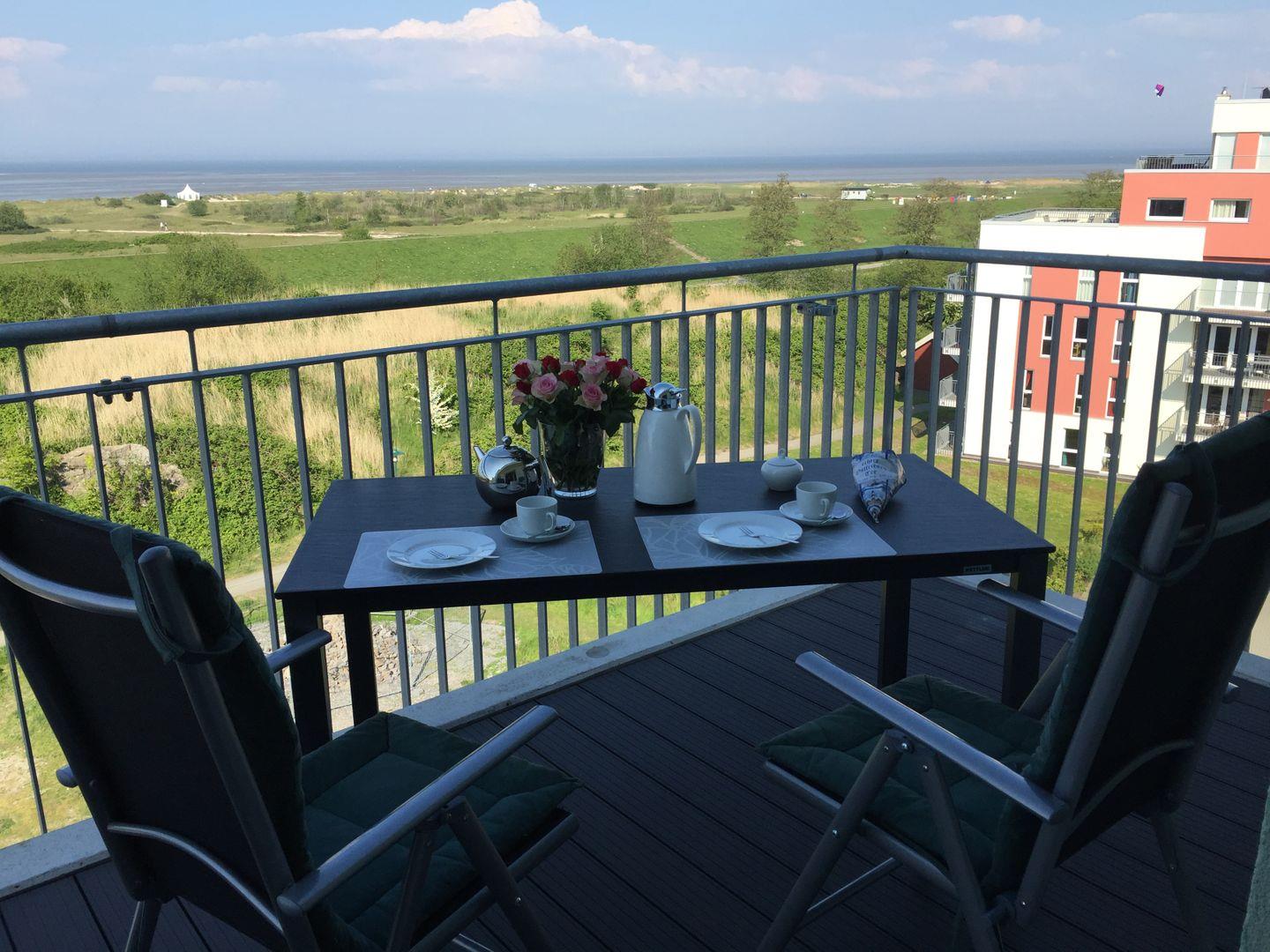 Auf dem großzügigen Balkon erwartet Dich ein Bereich, der zum Verweilen einlädt. Hier kannst Du die frische Seeluft in vollen Zügen genießen, während Du den atemberaubenden Blick auf das weite Meer und die vorbeiziehenden Schiffe bewunderst. Das Kiterevier am Horizont bietet spektakuläre Anblicke und weckt Abenteuerlust. Lass die Seele baumeln.