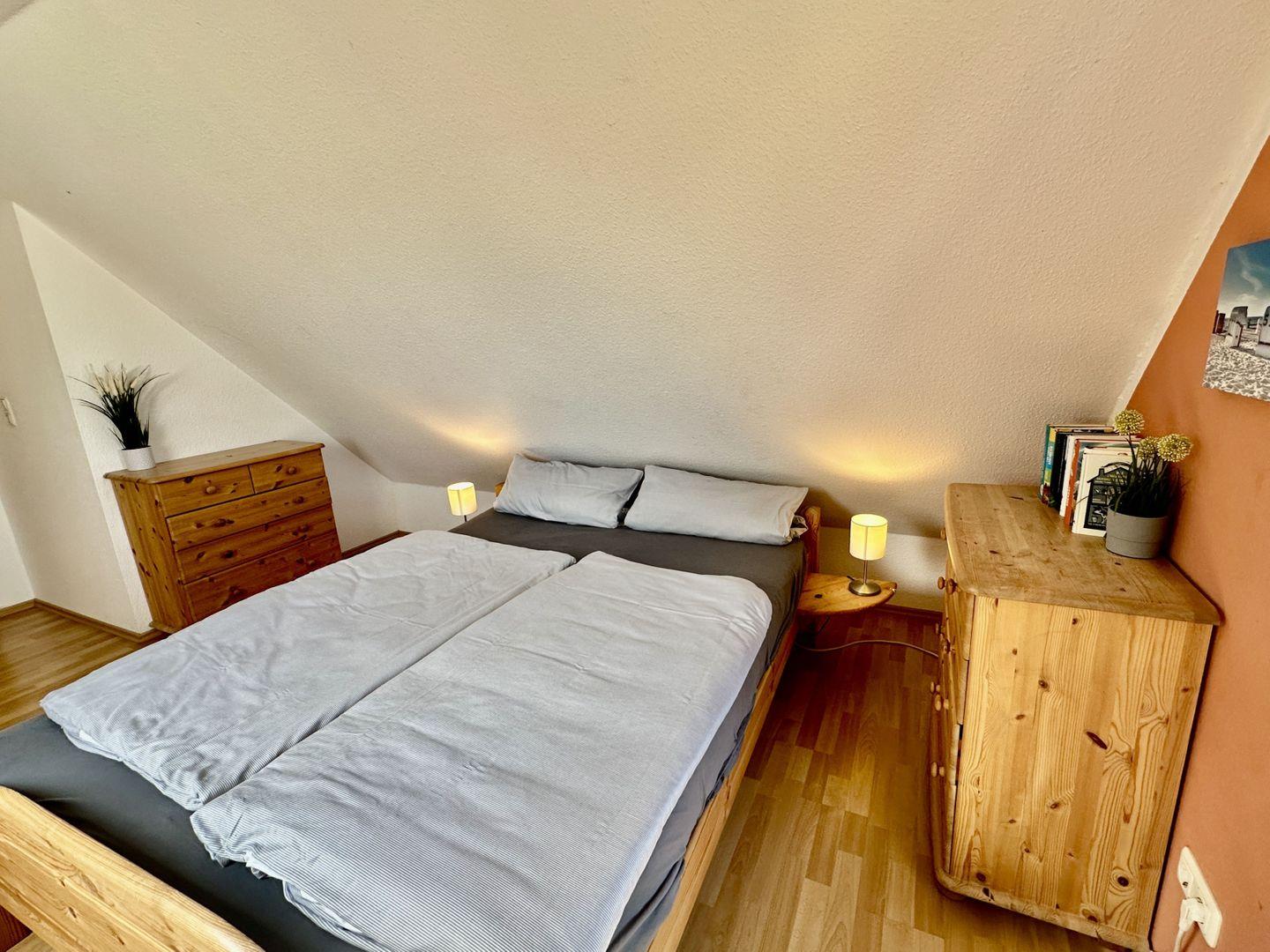 Der schmale Flur führt Sie zum unteren Badezimmer, das mit Dusche und WC ausgestattet ist. Es ist ideal für einen schnellen Frischekick zwischendurch. Über eine stabile Holztreppe gelangen Sie in die erste Etage, wo sich das geräumige Hauptschlafzimmer befindet. Das urige Holzbett und der großzügige Kleiderschrank verleihen dem Raum eine heimelige Gemütlichkeit, in der Sie sich sofort wohlfühlen werden.