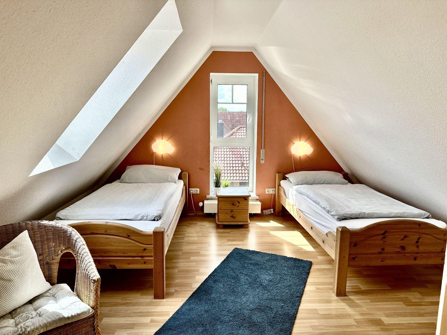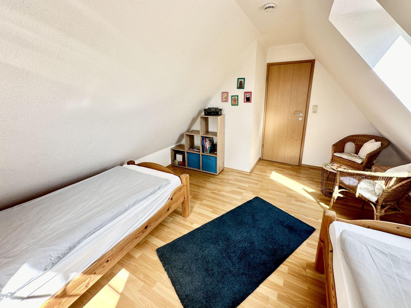 In der zweiten Etage warten zwei weitere gemütliche Schlafzimmer auf Sie. Eines ist mit einem komfortablen Doppelbett ausgestattet, das andere bietet zwei Einzelbetten – ideal für Kinder oder weitere Gäste. Beide Zimmer sind mit Kommoden für Ihre Wäsche und Sitzmöglichkeiten ausgestattet, sodass Sie hier ebenfalls Rückzugsmöglichkeiten finden. Ein kleiner Flur bietet zusätzlichen Stauraum mit einem Schrank und einer Kleiderstange. Alle Schlafräume sind mit Außenrollläden ausgestattet, um für eine ungestörte Nachtruhe zu sorgen.