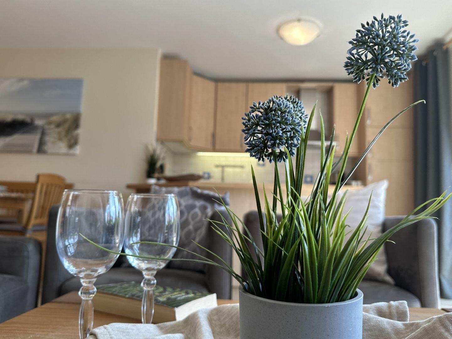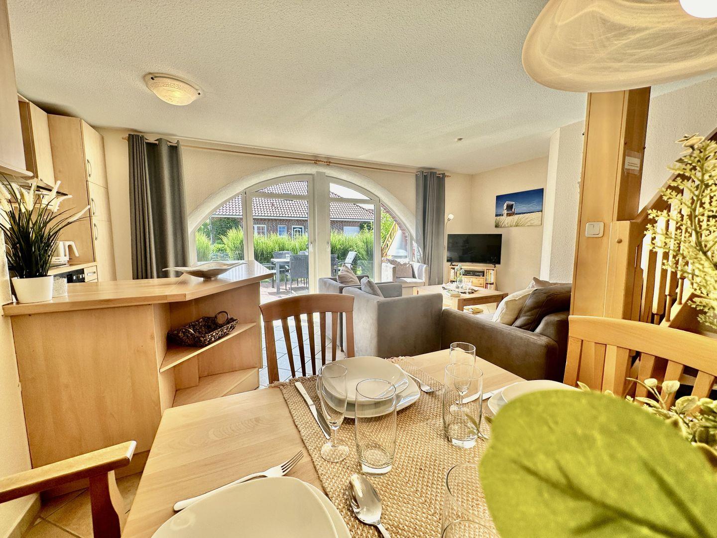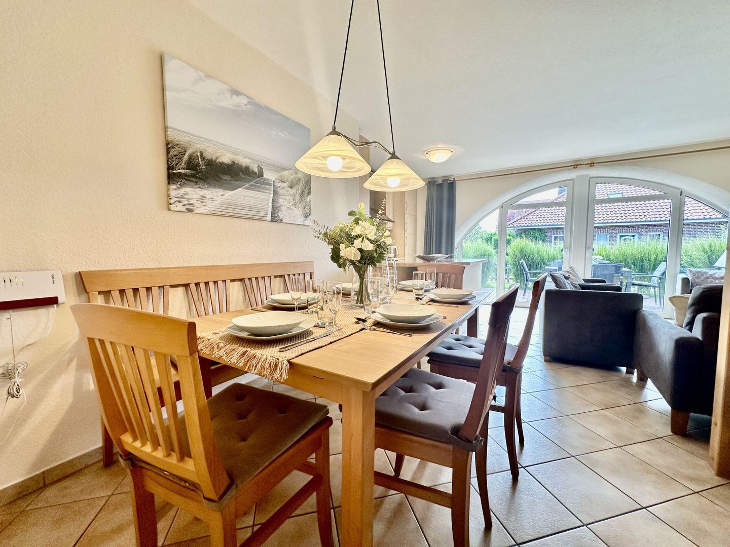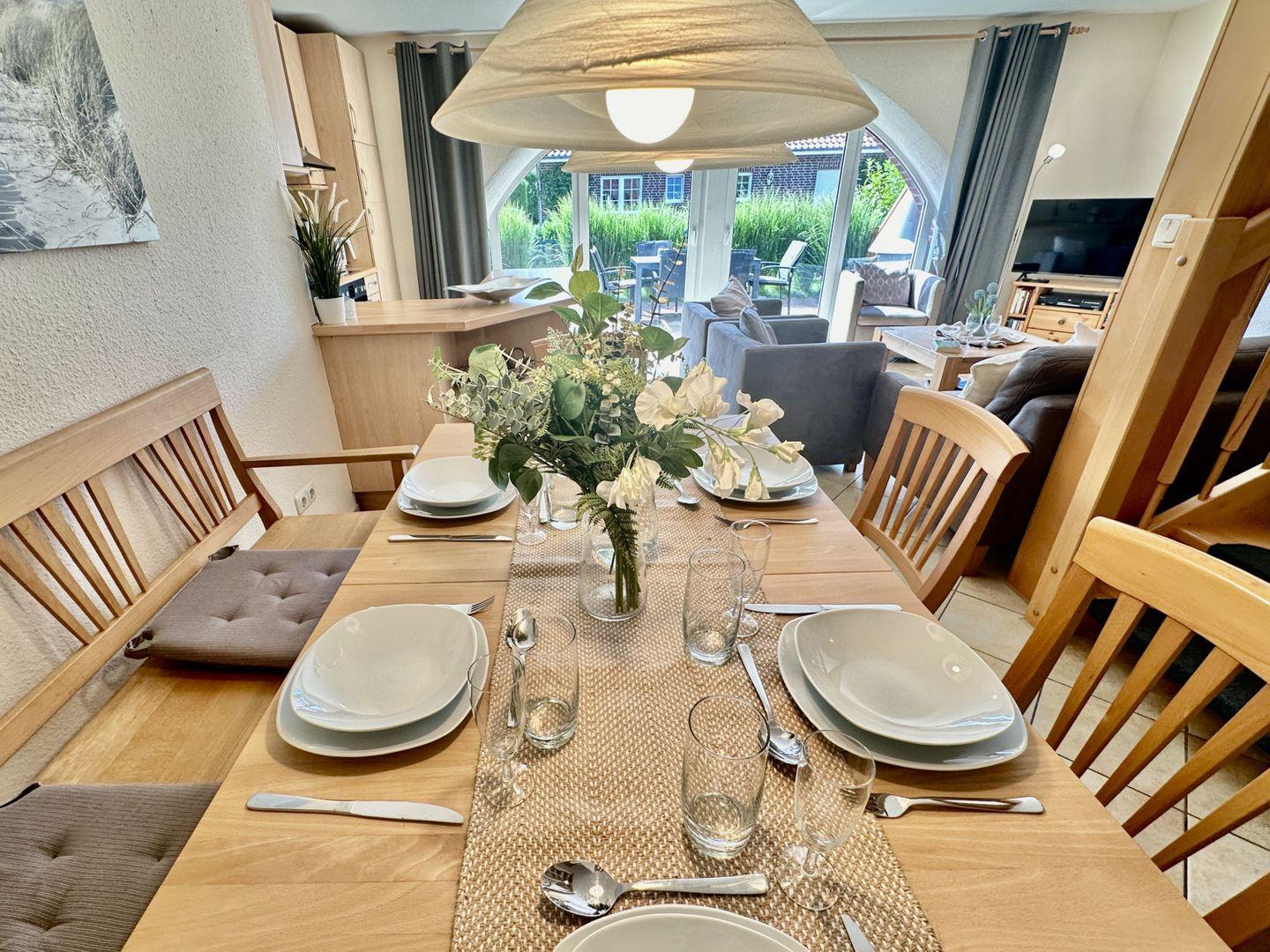 Gleich neben dem Wohnzimmer befindet sich der Essbereich, der das Herz des Hauses bildet. Am großen Esstisch, der Platz für 6 Personen bietet, genießen Sie gesellige Mahlzeiten und spannende Gespräche. Die angrenzende Küche ist voll ausgestattet und lässt keine Wünsche offen – ideal, um sich im Urlaub unkompliziert selbst zu versorgen. Kochen Sie Ihre Lieblingsgerichte, während die anderen in Sichtweite gemütlich zusammensitzen und sich unterhalten – hier sind alle vereint und dennoch frei, ihren eigenen Raum zu genießen.