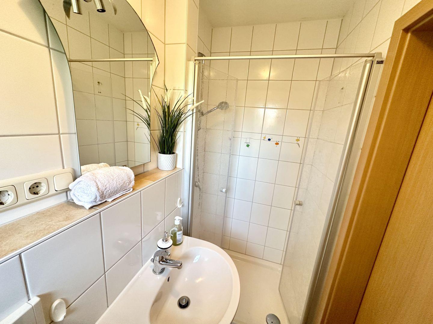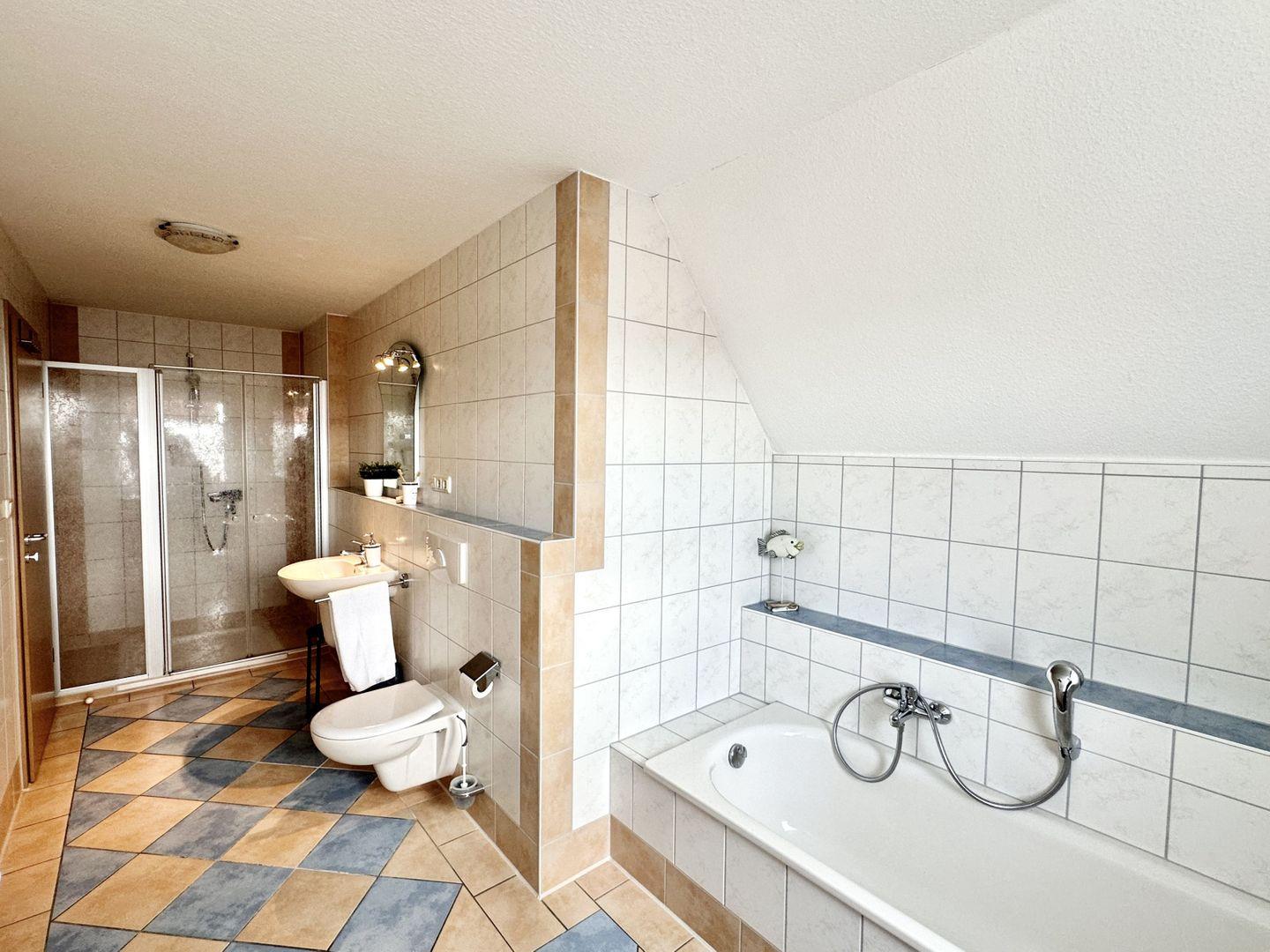 Auf dieser Etage befindet sich auch das zweite Badezimmer, das Sie mit seiner Größe und Ausstattung beeindrucken wird. Die große, ebenerdige Dusche bietet Ihnen erfrischende Duscherlebnisse, während die Badewanne perfekt für entspannte Momente ist. Ob ein schneller Sprung unter die Dusche nach einem Strandtag oder ein wohltuendes Schaumbad am Abend – hier bleiben keine Wünsche offen. Praktischerweise steht Ihnen im Badezimmer eine Waschmaschine zur Verfügung, die Ihnen den Komfort bietet, den Sie während Ihres Urlaubs benötigen.