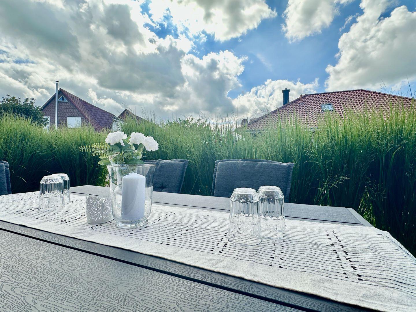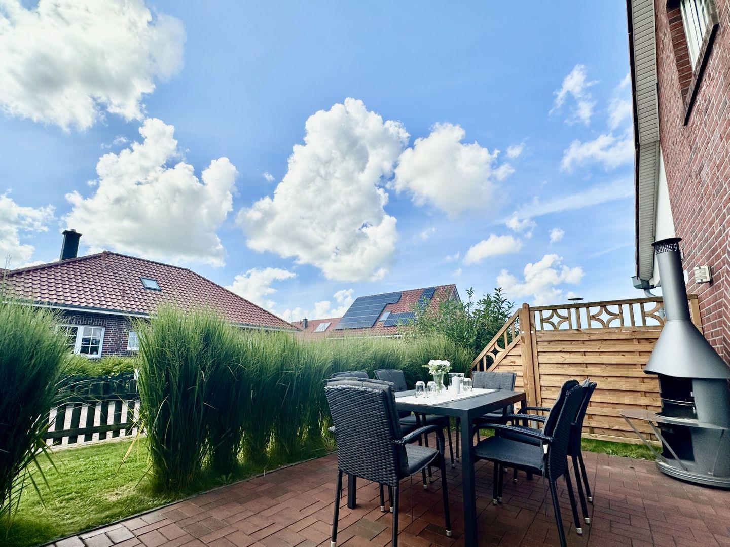 Ein Highlight des Ferienhauses Emmi ist die wunderschön in Grün eingebettete Terrasse. Sie bietet einen traumhaften Platz, um die Seele baumeln zu lassen – ob beim Frühstück in der Morgensonne oder bei einem Glas Wein am Abend. Hier können Sie den Tag in Ruhe ausklingen lassen und das Vogelgezwitscher genießen. Für perfekte Strandtage steht Ihnen zudem ein eigener Strandkorb am Strandhaus 1 zur Verfügung. Gönnen Sie sich hier eine Auszeit, während Sie den Blick über das Meer schweifen lassen und die frische Nordseeluft in vollen Zügen genießen.