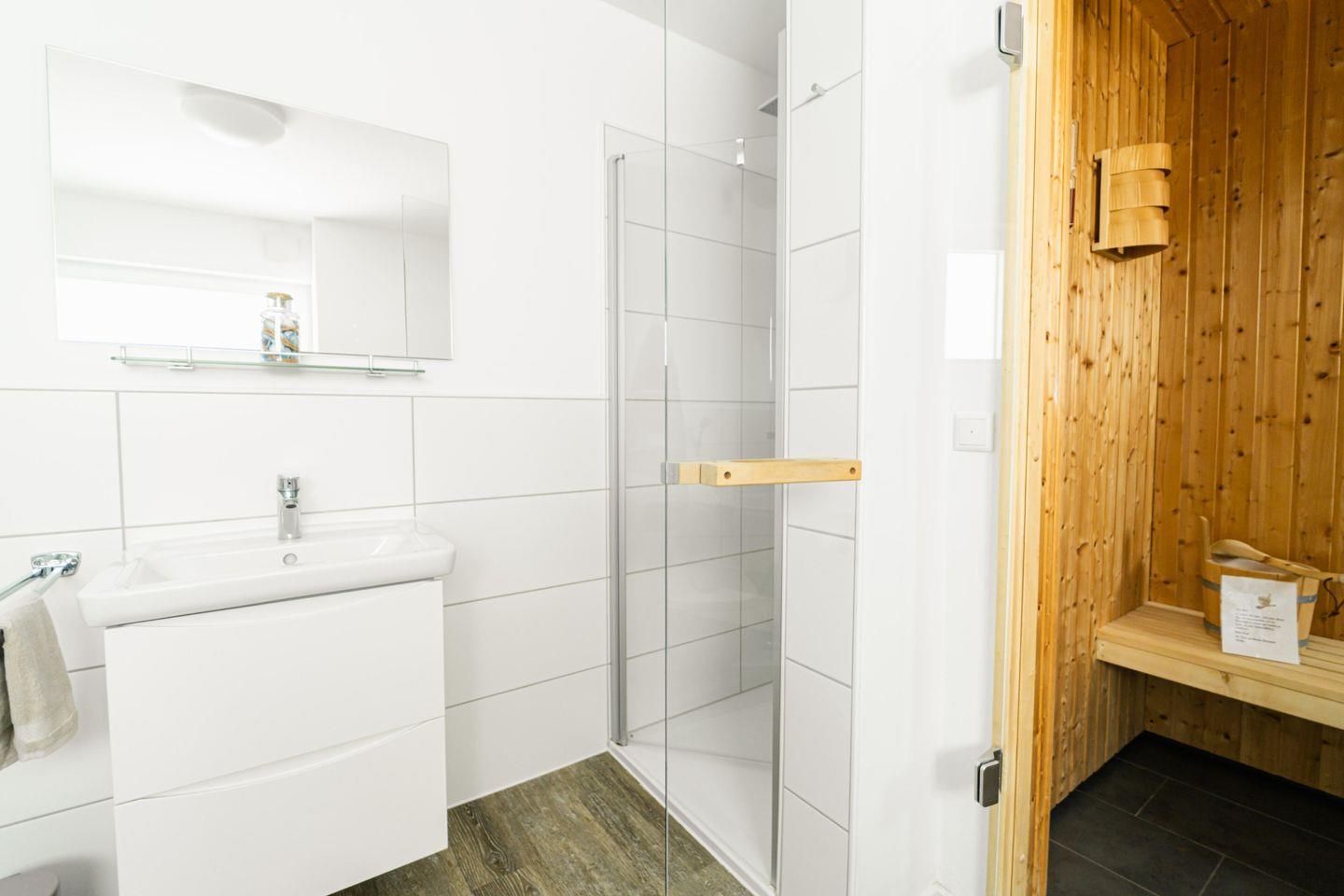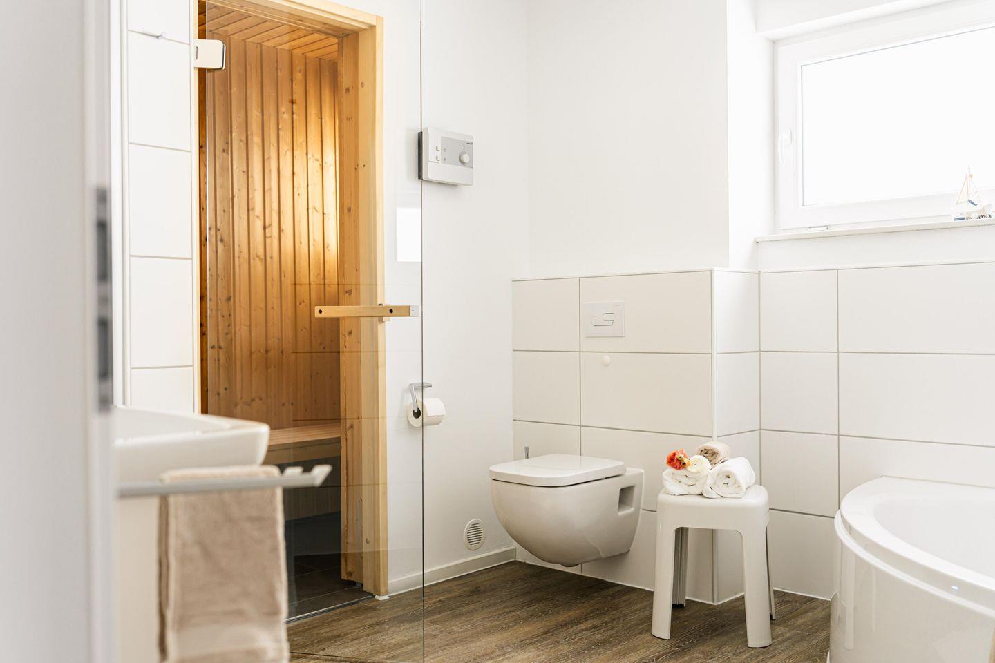 Nach einem Tag voller Abenteuer und Entdeckungen könnt Ihr Euch in der privaten Sauna wunderbar entspannen. Schließt die Augen und lasst die wohltuende Wärme wirken – ein perfekter Abschluss eines erlebnisreichen Tages an der frischen Seeluft.